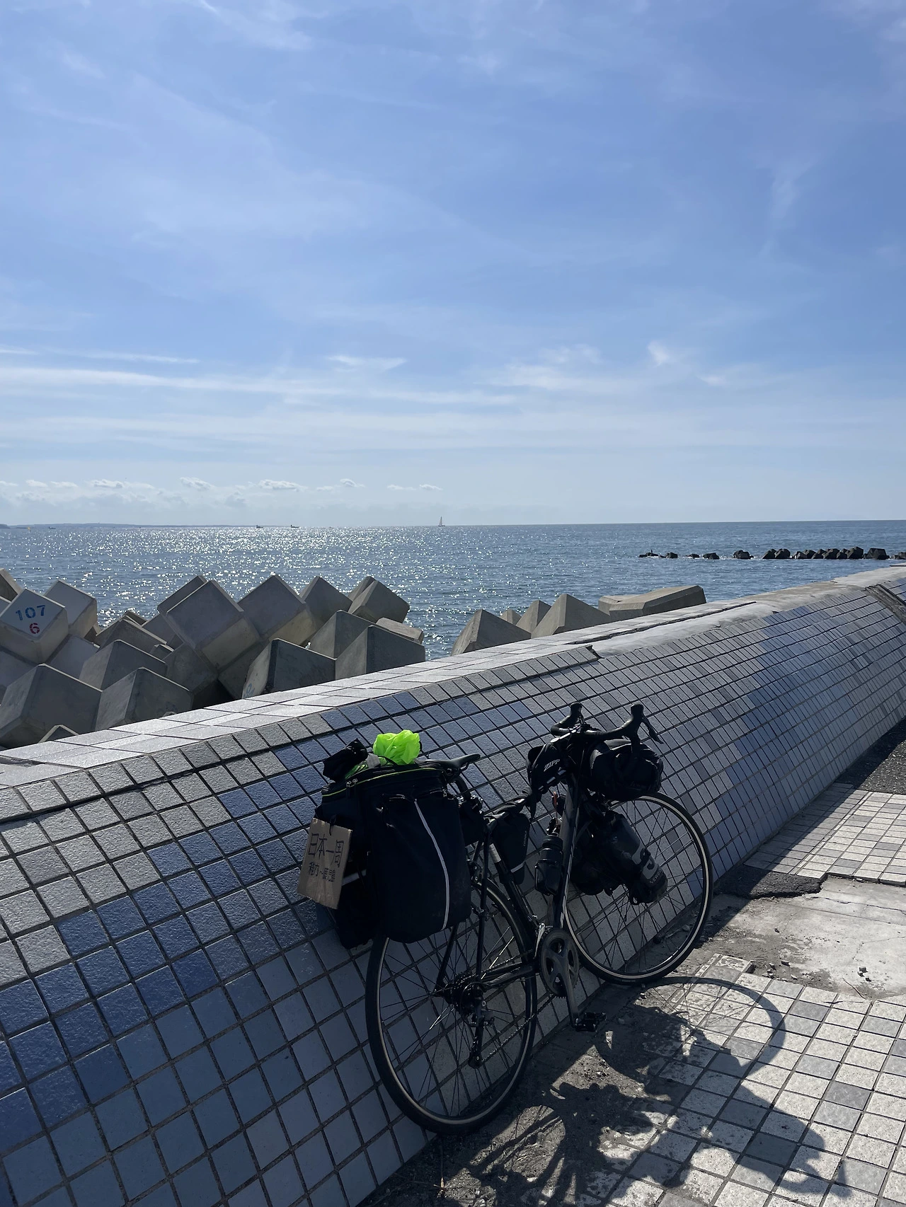그 순간 쌩하고 오른쪽으로 바이크 하나가 지나갔는데, 타고 있던 라이더가 한쪽으로 엄지손가락을 치켜들고 있었다. 순간 “뭐지?”라는 생각이 들었다. 나한테 준 따봉인가? 그제야 오늘 아침에 자전거 뒤에 ‘일본 일주’를 써붙였던 것이 생각났다. 너무 순식간에, 게다가 처음으로 누군가가 반응해 준 일이라 고맙다고 말할 겨를도 없었다.