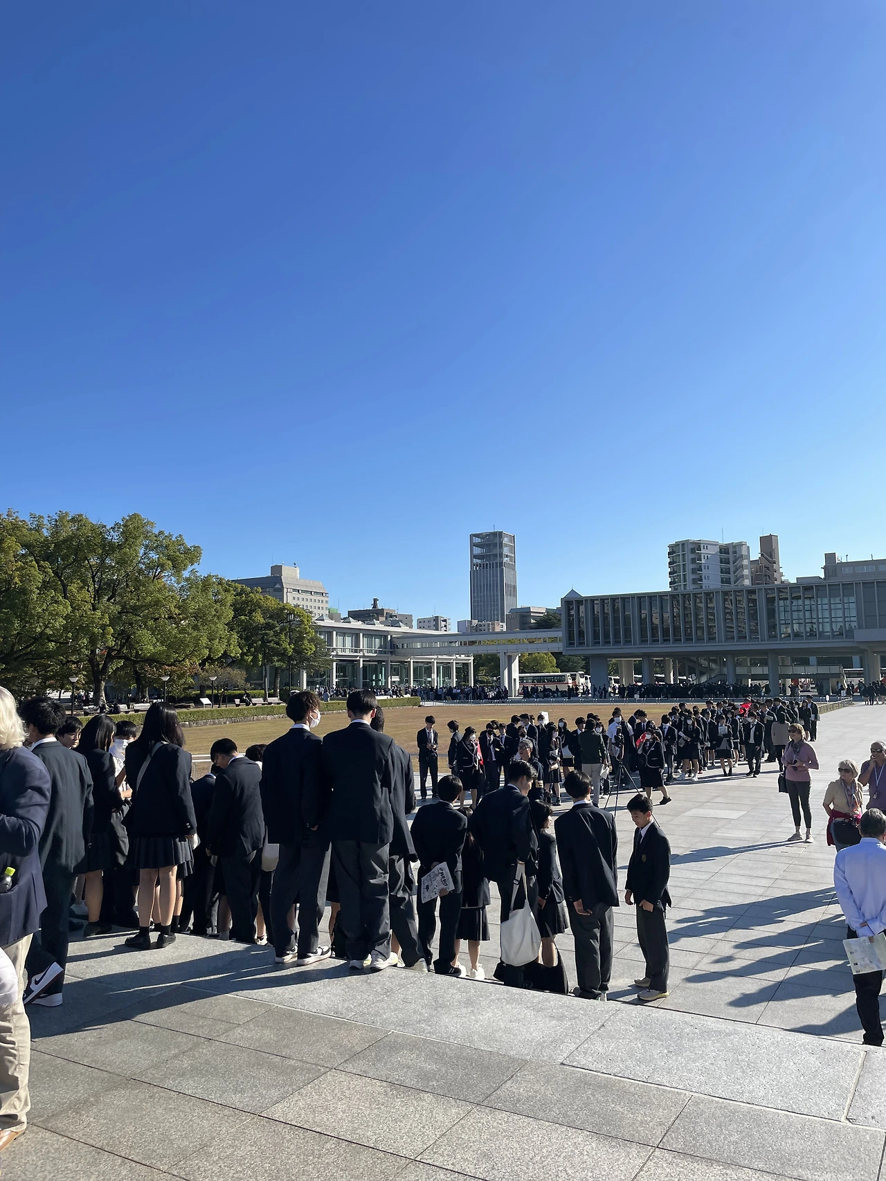 히로시마 평화기념공원은 유명한 일본 건축가인 단게 겐조의 작품으로, 제2차 세계 대전 당시 히로시마에 떨어졌던 원자폭탄으로 희생된 사람들을 기리기 위해 설계된 공원이다. 공원은 마치 교토와 비슷한 느낌이었다. 그 말은 교토처럼 역사가 살아 숨을 쉰다기보다는, 바로 서양인과 수학여행을 온 일본 초, 중, 고등학생 무리로 구성된 인파와 다시 조우할 수 있다는 것이다. 위령비 주변에서 사진을 찍느라 여념이 없는 서양인들, 그리고 앞에 오와 열로 줄을 서서 단체사진 차례를 기다리고 있는 교복을 입은 일본 학생들.