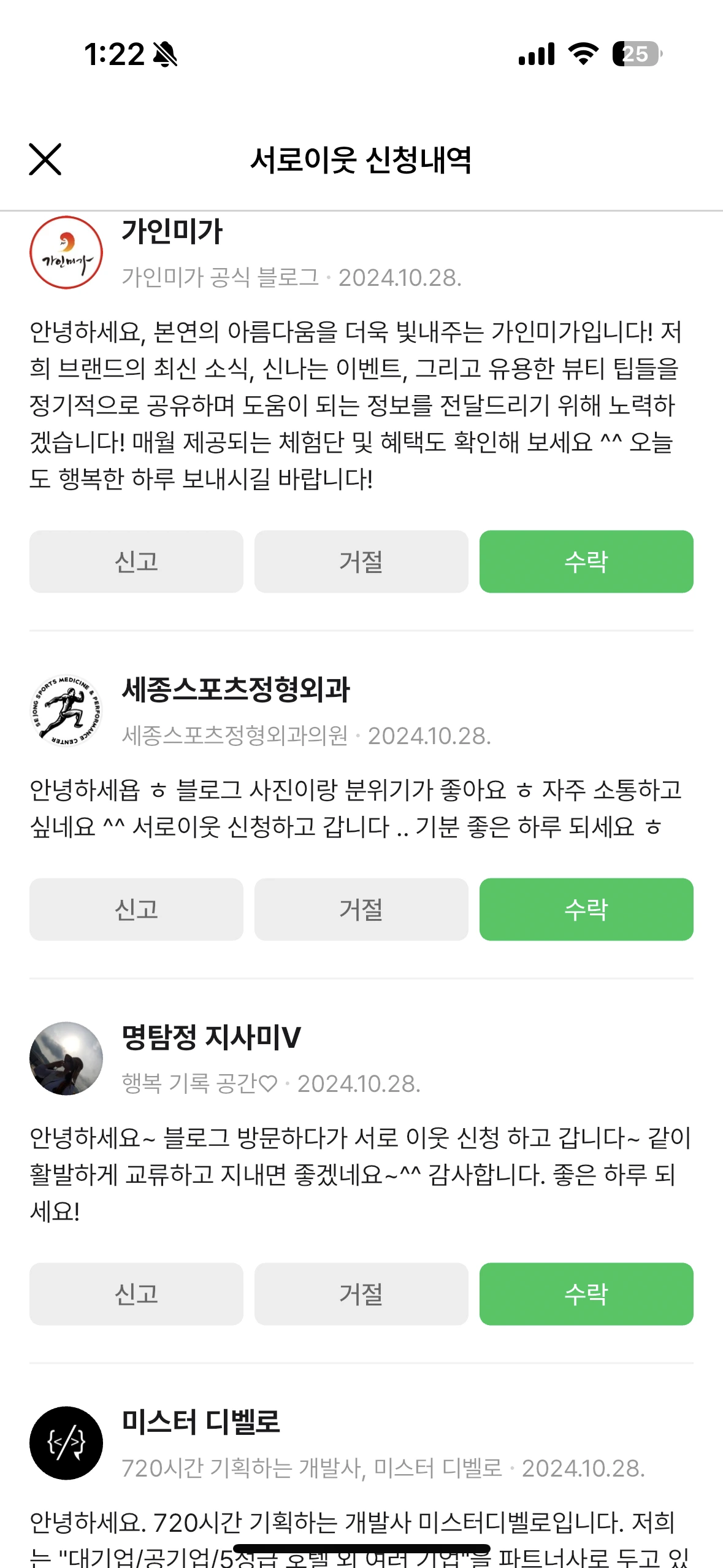 요즘 블로그에 글을 잘 올리지 않다가, 오랜만에 글빨이 살아나 연속으로 글을 올렸더니 알고리즘이 작동이라도 하는 듯 많은 이웃 추가 신청들이 들어왔다.