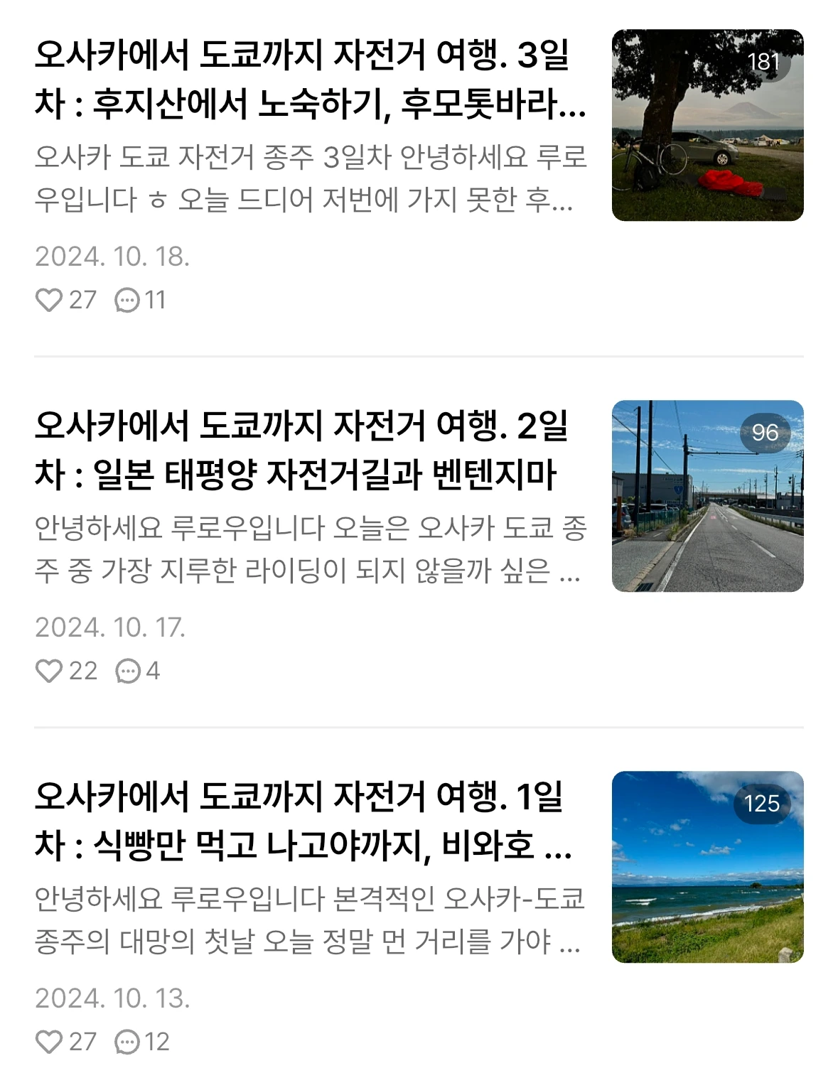 그렇게 블로그와 동시에 커뮤니티에 올렸던 새로운 여행기는 처참하게도 단 한 글도 추천글에 오르지 못했고 난 또 찌질하게 그게 부끄러워서 전부 글을 삭제했던 기억이 있다.