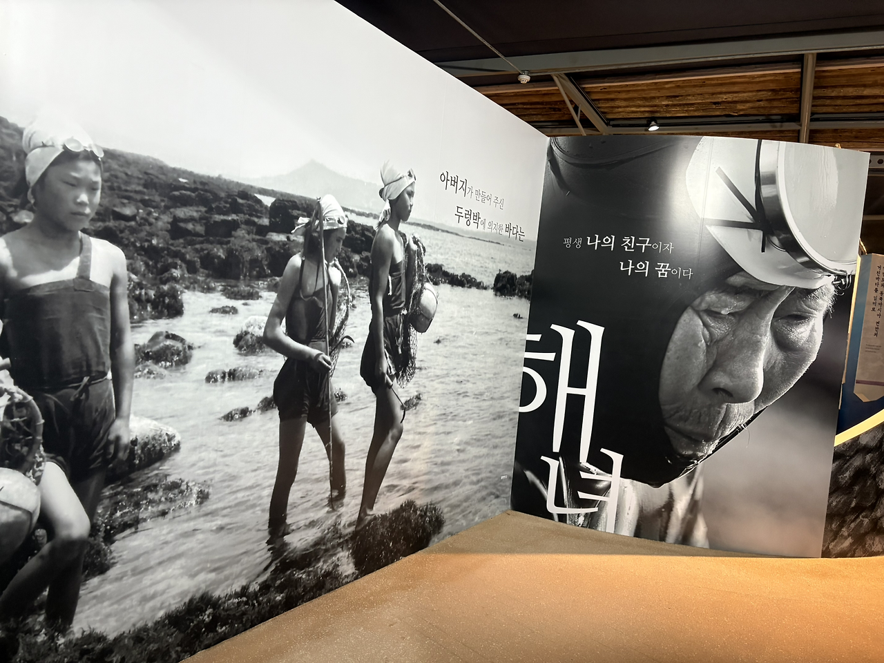 늦게까지 자느라 활동시간도 늦어지니 해가 가장 위세를 떨치는 시간에 도착했다. 사진으로 봤던 박물관의 모습은 그저 현대식 건물 하나 정도였는데 막상 도착하니 드넓게 펼쳐진 잔디와 숲이 눈에 들어왔다. 해가 중천에 있든 말든 박물관 앞 잔디광장에 전시된 불턱, 어업선, 제주항일운동에 앞장서신 구좌읍 대표 3인방 해녀님들의 동상을 찬찬히 둘러봤다. 그리고 제주항일운동 기념비 옆의 해녀의 노래비를 읽으며 해녀님들의 고단한 삶을 가히 짐작하며 들어선 박물관. 넷플 드라마 ‘폭삭 속았수다’를 통해 익숙해진 해녀님들의 생활도구들과 전시품들이었지만 가족과 사회를 위해 고단한 삶을 살아간 해녀님들에 대한 시선은 조금 더 깊어지는 듯했다. 조심스레 한발 한발 내디딜 때마다 그 삶에 대한 경외심이 밀려왔다. 그러다 마주한 시선을 사로잡는 사진. 울컥했다. 소녀에서 할머니가 되기까지 그들의 인생은 어땠을까? 여덟 살 어린 나이에 물질을 배우고 열두 살 즈음 해녀의 삶을 시작하여 상군해녀로 세월의 궤적을 엮어온 삶이며 새벽부터 황혼이 기울 때까지 물질을 하다 늦은 저녁 새끼에게 젖을 물리면서도 그 삶이 주어진 운명이라 거부할 줄 몰랐던 삶이다.