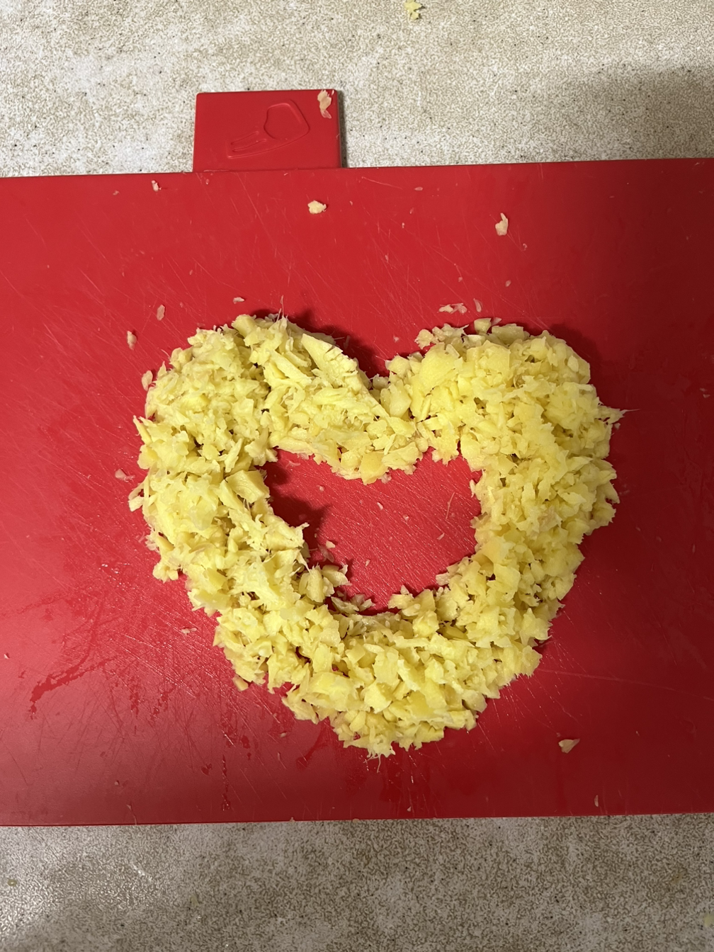 큰언니와 나는 서로 역할을 분담했다. 먼저 할 일을 다 해놓은 나는 언니의 작업이 끝나기를 기다리다가 심심해졌다. 그래서 빻아놓은 생강으로 하트를 만들었다. 서둘러 작업을 끝낸 언니가 하트생강을 보더니 웃음이 빵 터진다.