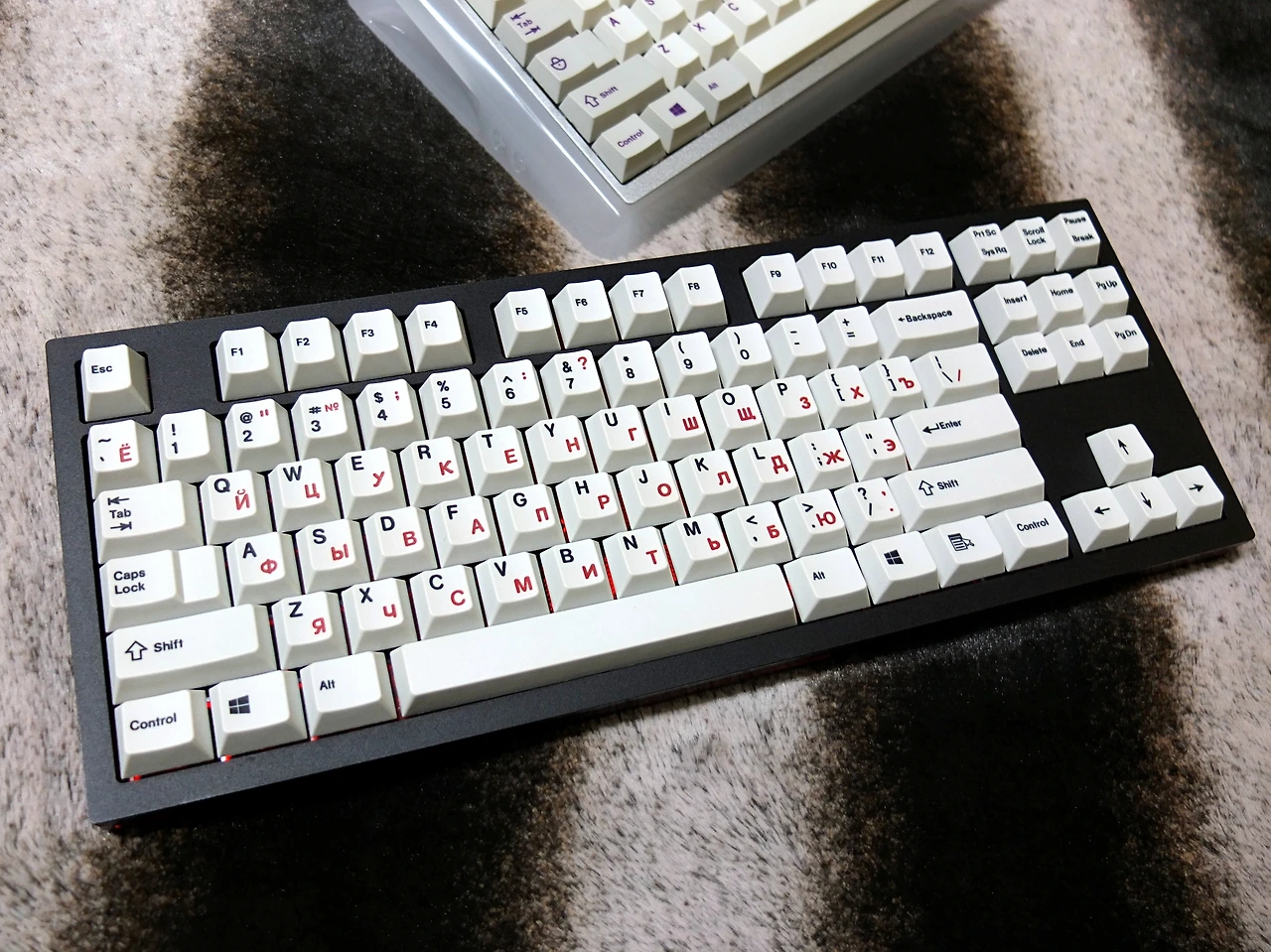 배열은 빨간불과 동일하지만, 색상이 베이지 투톤이라서 조금 더 빈티지한 느낌을 줍니다. 얇은 키캡의 특성도 있어서 체리 청색축으로 이식하면 나름 리드미컬한 사용도 가능합니다. 개인적으로 체리 MX스위치 중에서 청색축을 가장 비선호하지만, 왠지 모르게 청축 키보드를 여러 대 가지고 있습니다.