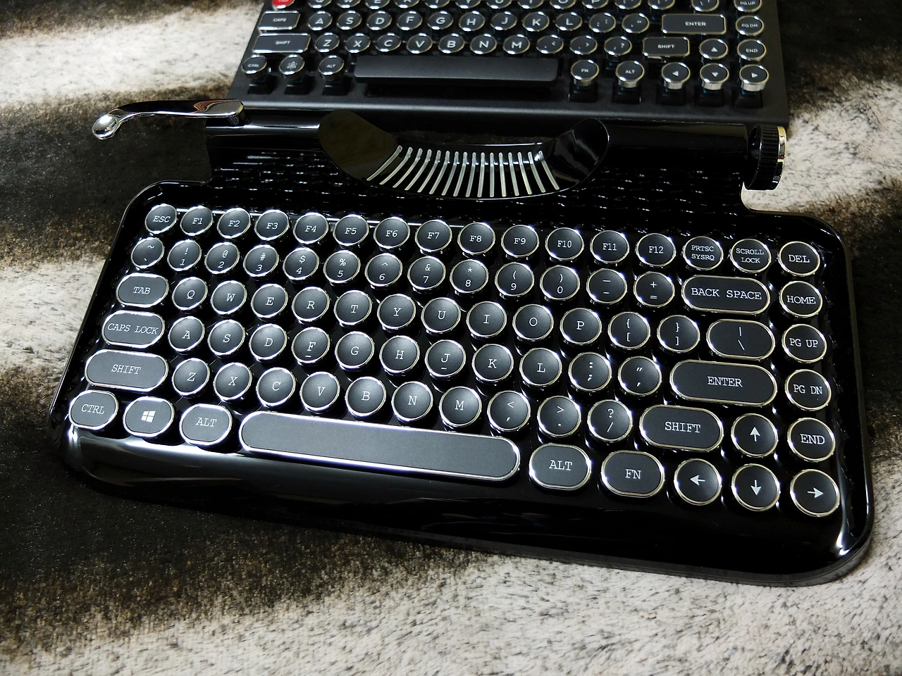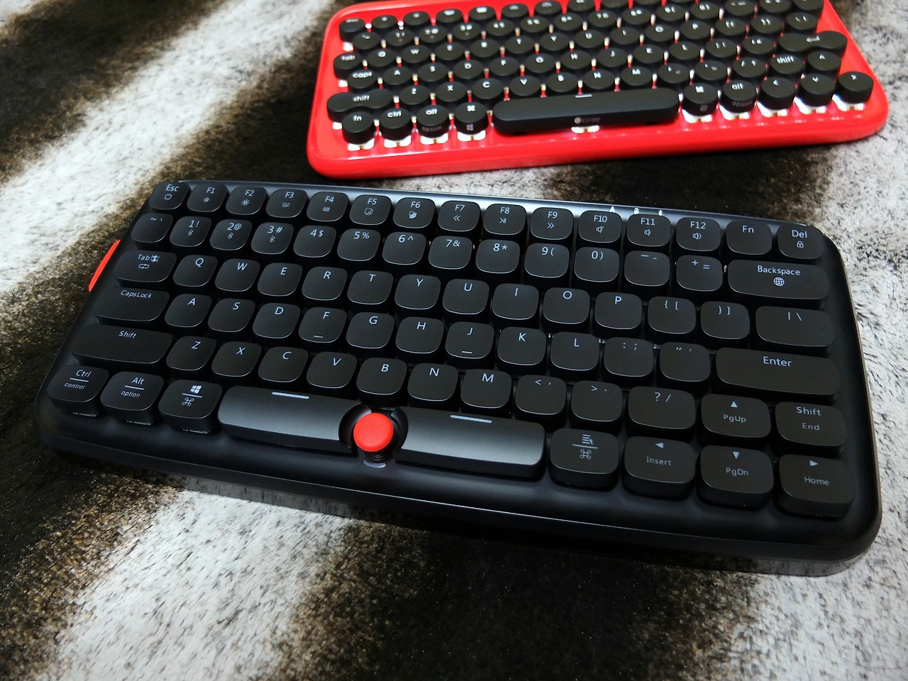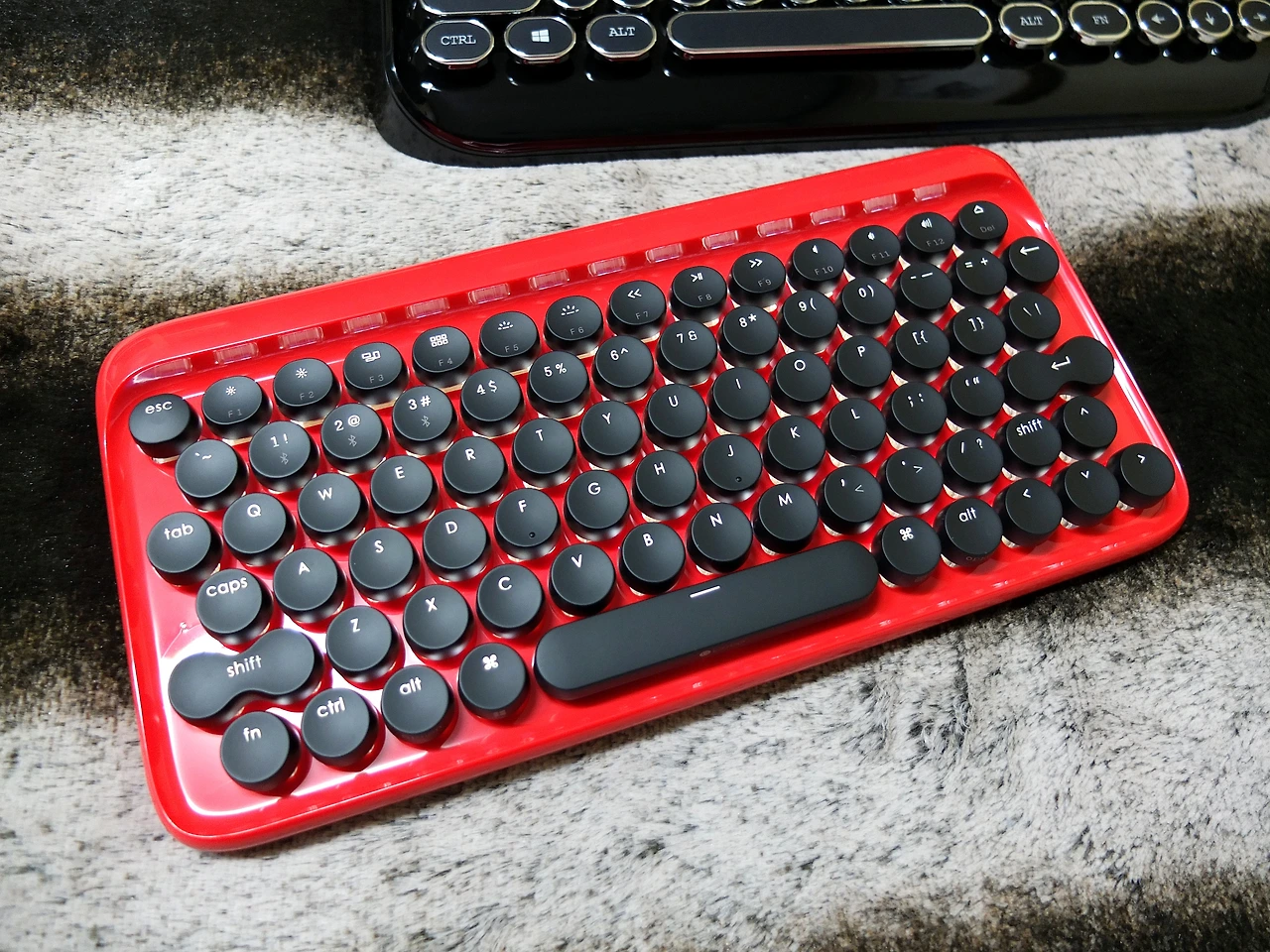 외관은 레밍턴 타자기가 연상되는 빨간색 키캡과 캐리지 리턴 레버가 인상적입니다.