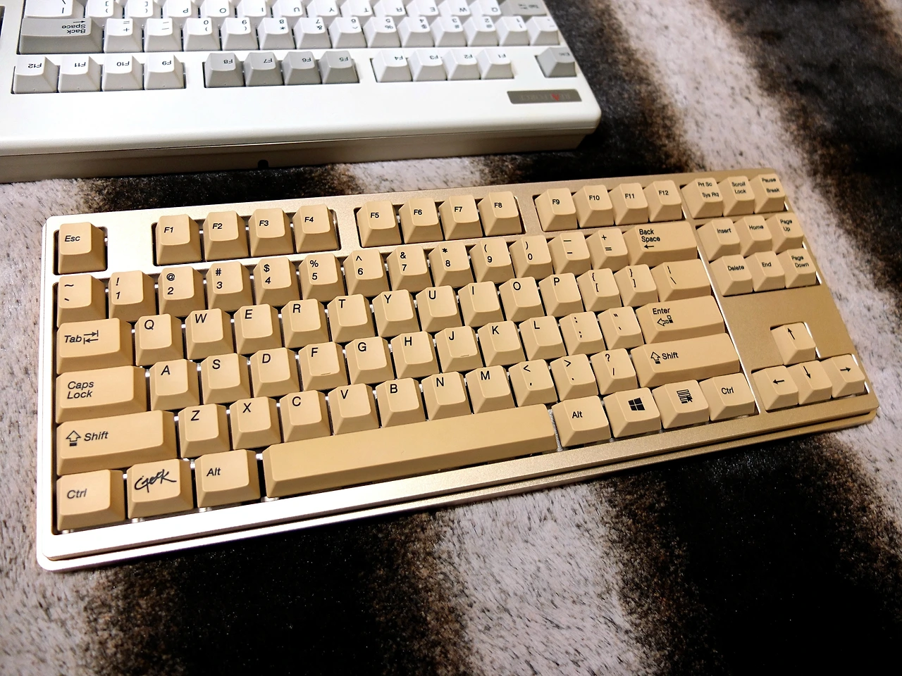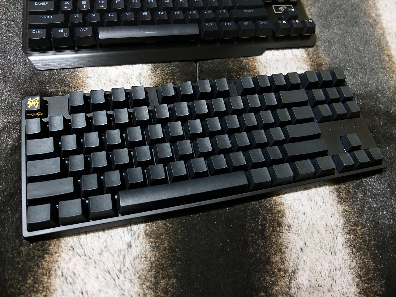 실제로 금색에 가까운 샴페인 골드 하우징과 일반적인 키보드에서 소화하기 힘든 란토 키캡이 제법 어울립니다. 개인적으로 TX87에서 느끼는 매력 포인트는 역시 상단과 하단이 만나는 층부분이라고 생각합니다. 2016년 당시에는 키압이 높은 체리 백색축 클릭과 알루미늄 나름의 조합성을 기대하고 만들었지만, 이제는 엉망진창 된 키감을 즐기는 상황입니다.
