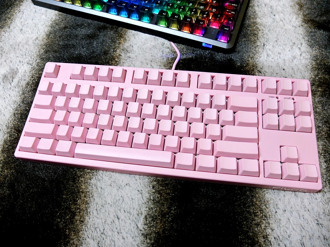 개인적으로 2005년부터 필코 키보드를 여러 가지 구입하던 편이었습니다. 하지만 마제스터치 텐키리스 모델이 출시했어도 막상 구입하지는 않았습니다. 시간이 지나서 구입 것은 의외로 핑크. 다소 용기가 필요한 색상이지만, 귀엽기도 하고 예쁘기도 해서 색상적인 욕망이 생기면 사용하곤 합니다. 본래의 키캡은 하우징보다 옅은 분홍이라, 최대한 비슷한 색상의 무각으로 바꿔줬습니다. 그리고 F와 J키에는 일부러 사용자 손가락에 혼란을 주고자 돌기가 없는 키캡을 장착해 뒀습니다. (의미가 없는 도난방지기능입니다.)