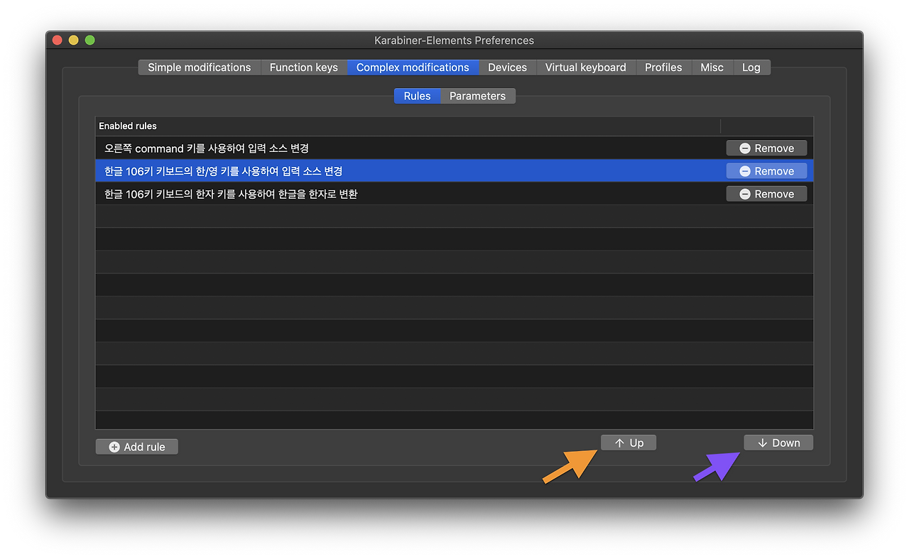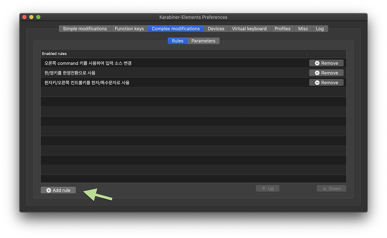 6. [Complex modifications]에서 하단의 [Add rule]에서 필요한 기능을 [Enable] 합니다.