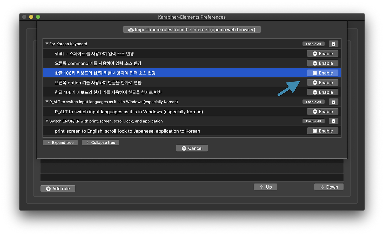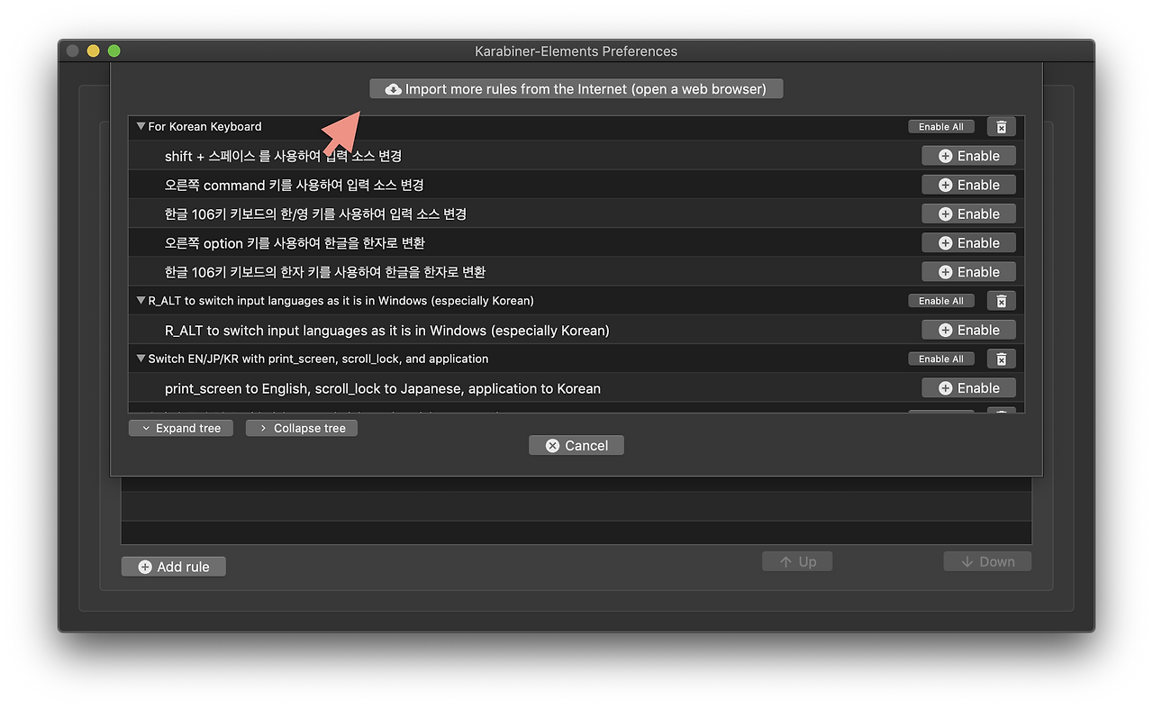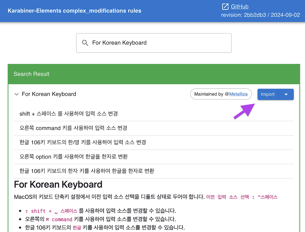- 바로가기 링크: https://ke-complex-modifications.pqrs.org/#for_korean_keyboard
