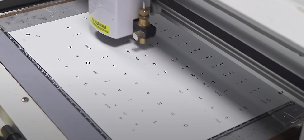 밝은색 키캡에는 각인이 실질적으로 필요한 부분(표면과 정면에서 보이는 측면만)을 재단하여 사용합니다.