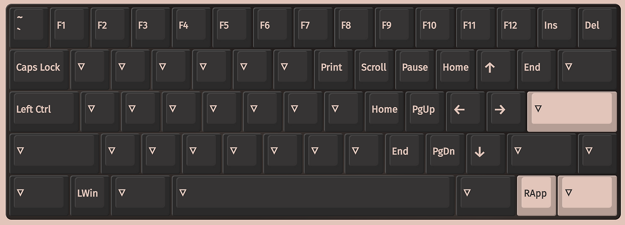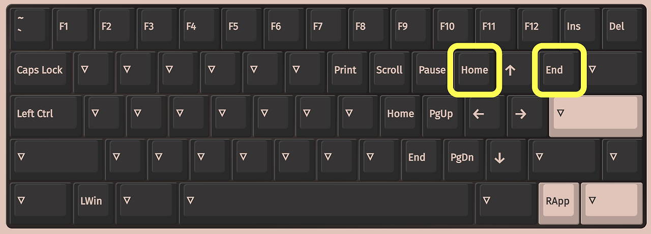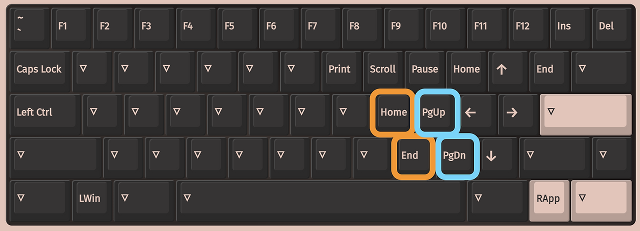 이유는 개인적으로 방향키와 Home, End를 자주 쓰는 편입니다. 가끔은 키보드의 크기에 따라서 Fn1 상태에서는 홈과 엔드를 누르는 것이 너무 멀리 느껴져서, 저렇게 방향키와 가까운 좌우측에 홈엔드를 추가하는 것으로 해결하곤 합니다.