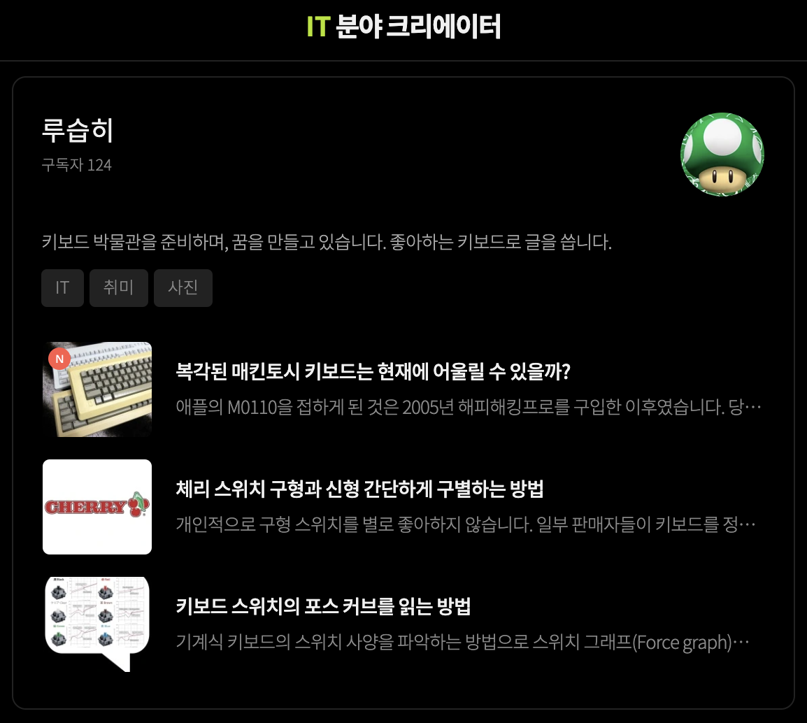 이번에 확인해 보니 IT 분야에는 100명의 크리에이터가 있다는 것을 알게 되었습니다. 하지만 이 페이지는 구독자가 많은 분들 중심으로 10명의 글만 상단에 소개될 뿐이고, 최신 글을 발행해도 상위 노출이 안 돼서 기능이 좋다는 인상은 받지 못했습니다. 게다가 새로고침을 해도 일정한 시간 동안 기존 글만 계속 보여줄 뿐이고, 재미있는 글을 찾아보거나 다른 분야에 흥미를 느끼기에는 여러모로 부족하다는 생각이 듭니다.