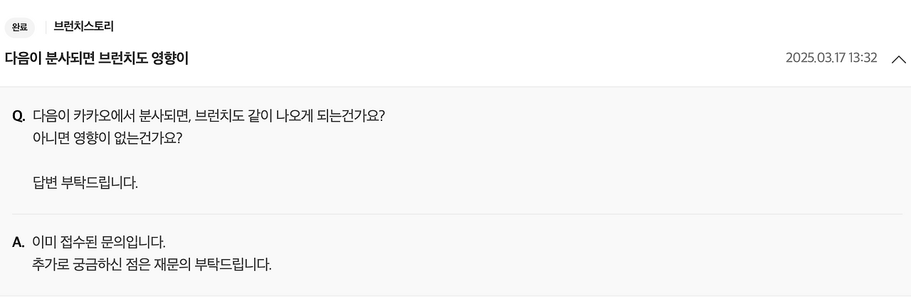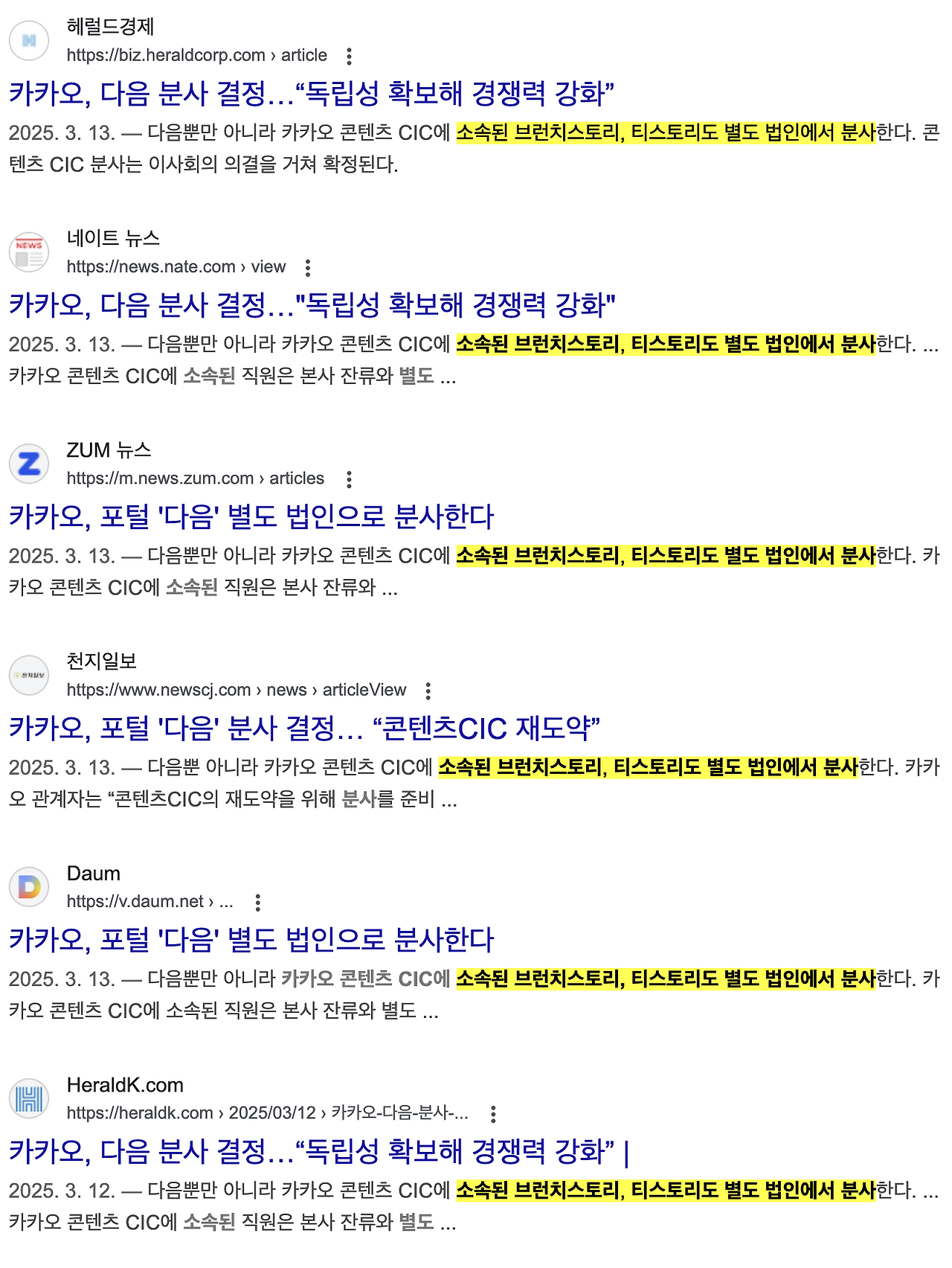 언론에 따르면 "다음뿐만 아니라 카카오 콘텐츠 CIC에 소속된 브런치스토리, 티스토리도 별도 법인에서 분사한다. 카카오 콘텐츠 CIC에 소속된 직원은 본사 잔류와 별도법인 이동 중 하나를 선택할 수 있다." 라고 알려져 있습니다. 이 부분은 카카오의 보도자료 인용문에 가깝습니다.