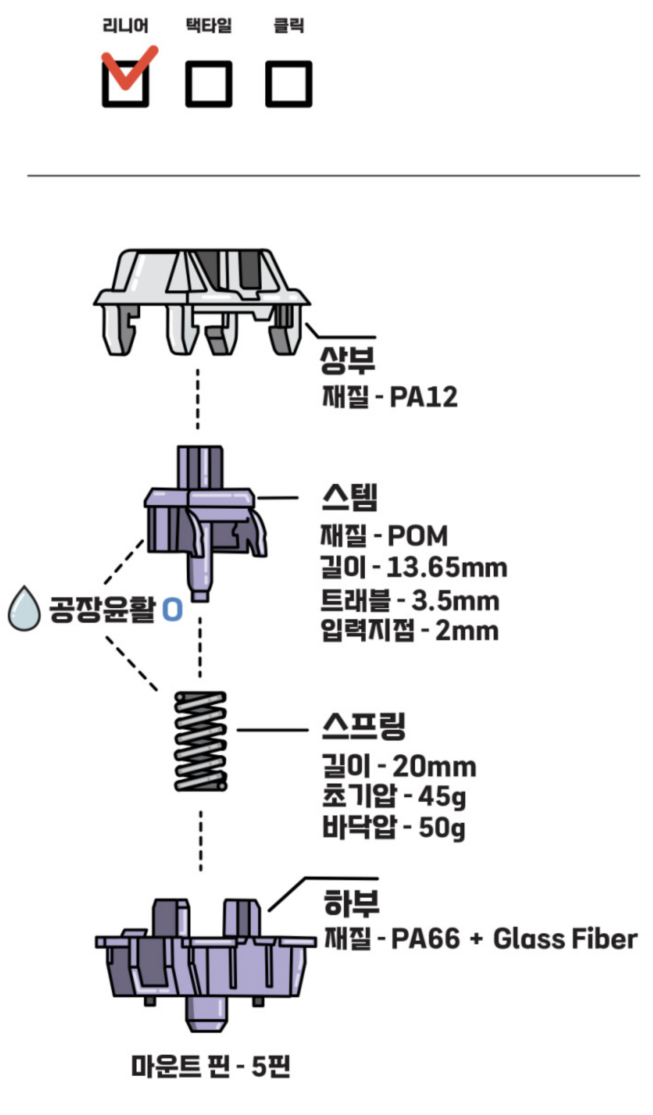 캣민트의 특징은 "Nylon 베이스의 PA에 유리섬유가 블렌딩되어, 맑은 하이피치로 바닥을 치는 리니어 스위치"로 소개되어 있습니다. 트래블이 3.5mm 이므로 롱폴 스테빌라이저를 사용하거나, 고무링이나 와셔로 키캡의 수평과 장착력을 맞춰줄 필요가 있습니다.