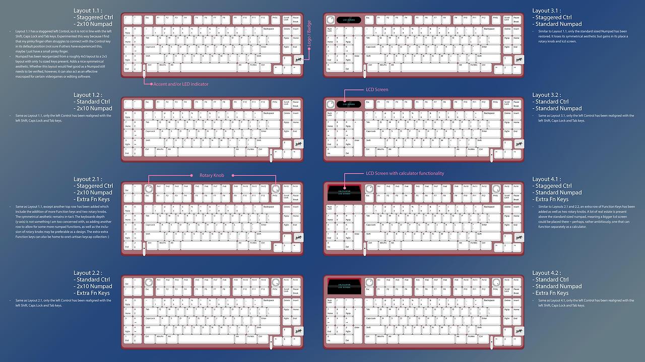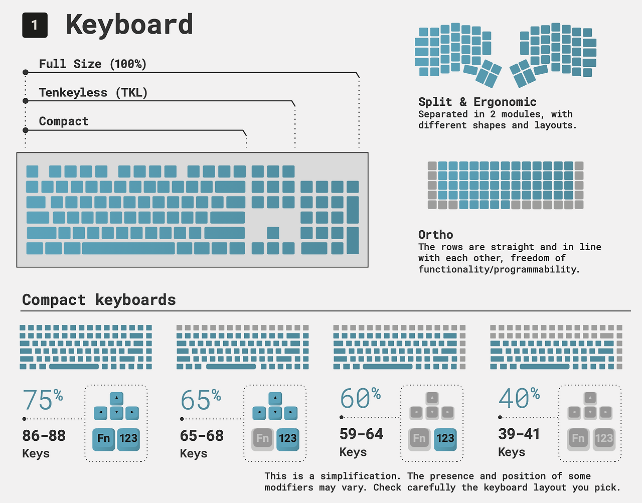 현재의 키보드 배열은 기계식 키보드의 유행과 커스텀 키보드의 보급화로 인해서, 풀사이즈와 대비해서 크기를 퍼센트(%)로 구분하고 있습니다. 과거처럼 사이즈 별로 풀사이즈(100%), 텐키리스(80%), 컴팩트(75%), 미니사이즈(65~40%), 내추럴, 어고노믹, 1800, 터미널 배열 등으로 다양하게 부르던 시대보다 간략해진 기분입니다. 게다가 키보드를 각 언어 배열과 키 개수로 구분하던 시기와는 많이 달라진 상황입니다. (예: 101타입, 102타입, 103타입, 104타입, 106타입, 109타입 등등)