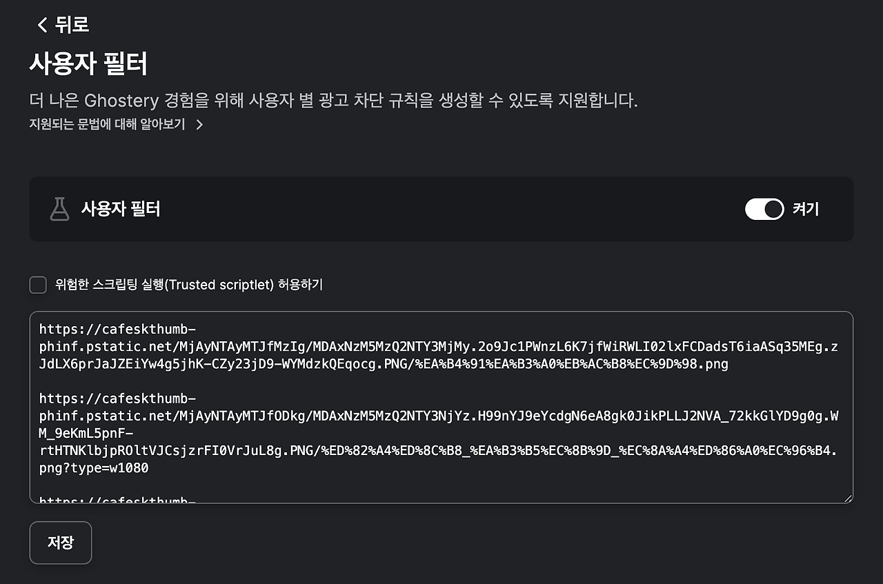특히 블로그나 카페에서 게시물로 등록하는 대문 광고는 1~2회 보는 것은 괜찮아도, 매일 본다면 눈이 피로하게 느껴지기도 합니다. 애드블록 계열의 광고 차단기에서는 게시물 레이아웃이 통채로 제거되기도 하는데, 그럴 때는 사용자 필터에 이미지 주소를 직접 넣는 편이 나았습니다.