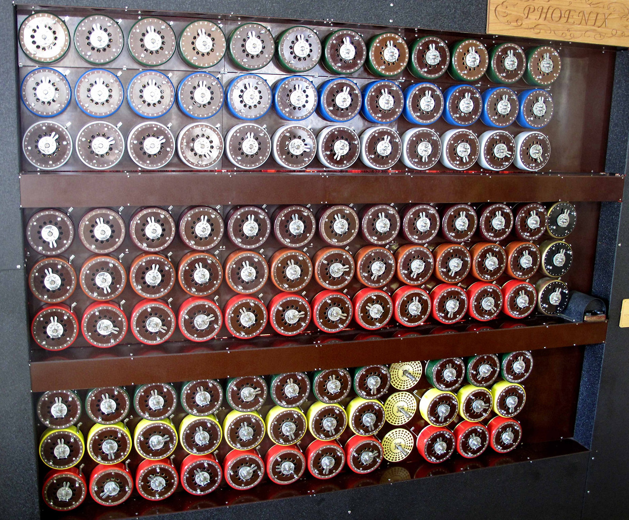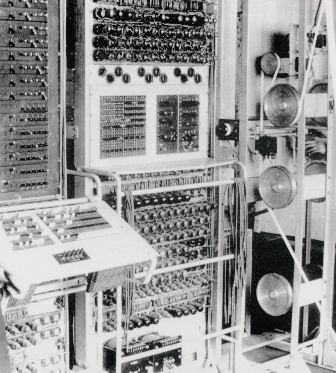 하지만 그전에 현대 컴퓨터과학을 정립한 앨런 튜링(Alan Turing)이 개발한 장치를 살펴볼 필요가 있습니다. 그것은 1939년에 개발한 봄브(Bombe)입니다. 봄브는 에니그마 암호를 해독하기 위한 계산기, 그리고 이후에 나온 콜로서스는 로렌츠 암호 해독을 위해서 제작된 프로그래밍이 가능한 컴퓨터입니다. 여기에 사용되는 입력장치는 기계적인 스위치가 있지만, 키보드에 가까운 물건은 아니었습니다. 게다가 이 당시의 컴퓨터는 플러그와 스위치를 통해서 프로그램되고 작동되었기에, 아직은 쿼티 키보드가 필요하진 않았습니다.