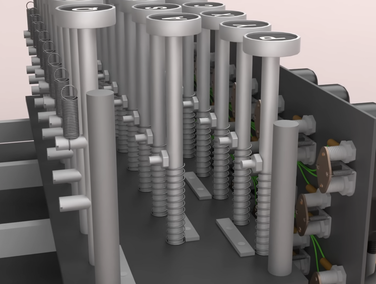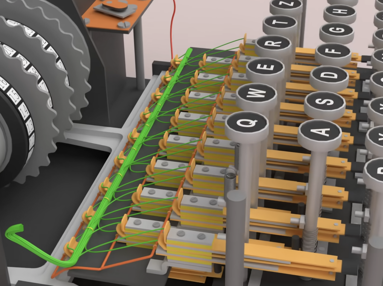 이번 글에서 에니그마를 다루는 이유는 컴퓨터 개발 역사에서 봄브가 자주 언급되며, 그 봄브는 나치 독일의 암호기계인 에니그마를 해독하기 위한 장치입니다. 조금 다르게 생각하면, 이러한 과정이 저 멀리 독일에서 에니그마용으로 입력된 키보드를 영국에서 컴퓨터로 다시 해석하는 과정처럼 느껴집니다. 그렇다고 에니그마에 내장된 키보드가 최초의 기계식 키보드는 아니지만, 독일어권 사용자들에게 익숙한 QWERTZ 배열이니 꽤 그럴듯하게 보입니다. 기계식 스위치로 유명한 체리社도 독일 기업입니다. 그럼 에니그마가 작동하는 모습을 보면 더 자세히 알 수 있지 않을까요?