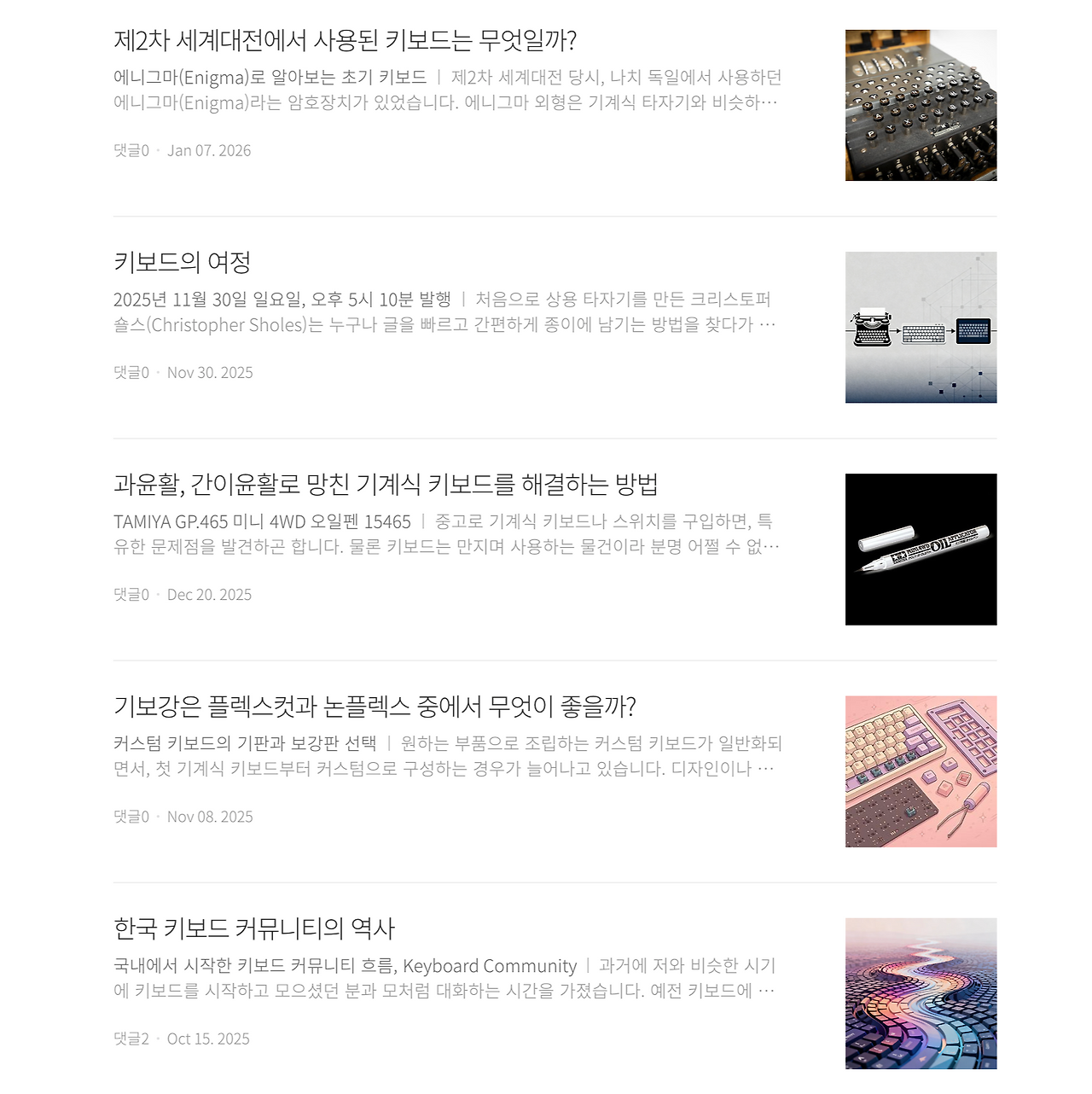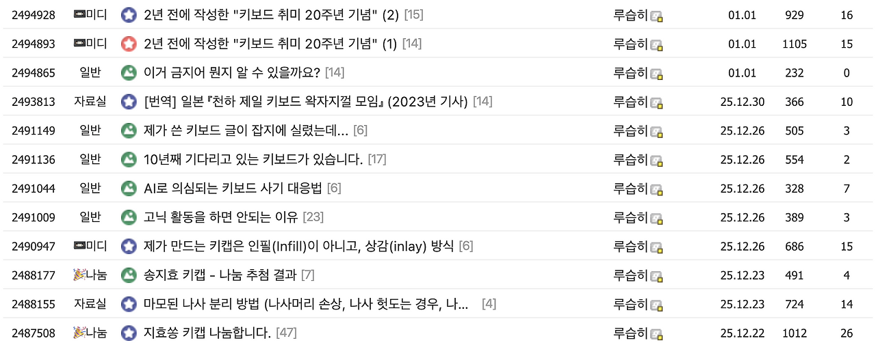 기키갤(기계식키보드 갤러리)의 개념글은 아마도... 나를 조금이라도 아는 분들이 응원 차원에서 추천을 누르는 경우가 있는 듯했다. 그런 생각이 들었던 시점은 일반적인 키보드 사진이나 잡담글에도 가끔씩 개념츄가 있었기 때문이다. 글 쓰는 것을 즐기는 편이라 작은 추천과 비추도 관심이라 생각되어 괜히 기쁘다. 그래서 최근에는 브런치로 발행한 글을 최대한 짧은 기간에 갤러리로 공유하고 있다. 기계식 키보드를 2004년에 처음 구입하고, 키보드에 대한 글을 쓰기 시작한 지 22년이 되는 시점에 색다른 시도를 해보고 있는 셈이다. 갤은 다양한 피드백을 솔직하게 들을 수 있다는 부분에서 굉장히 재미있게 활동하고 있다.