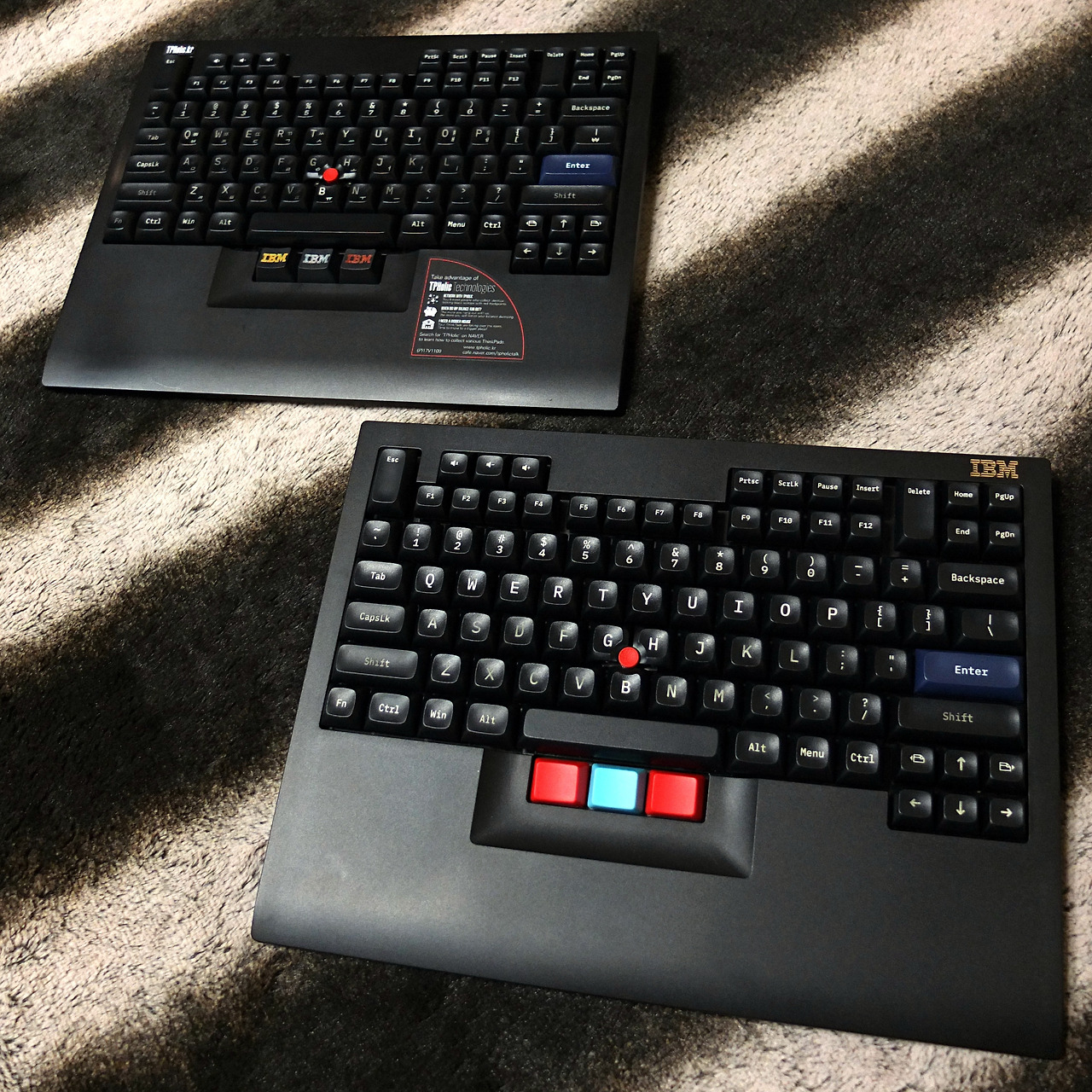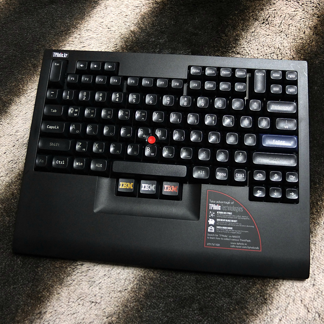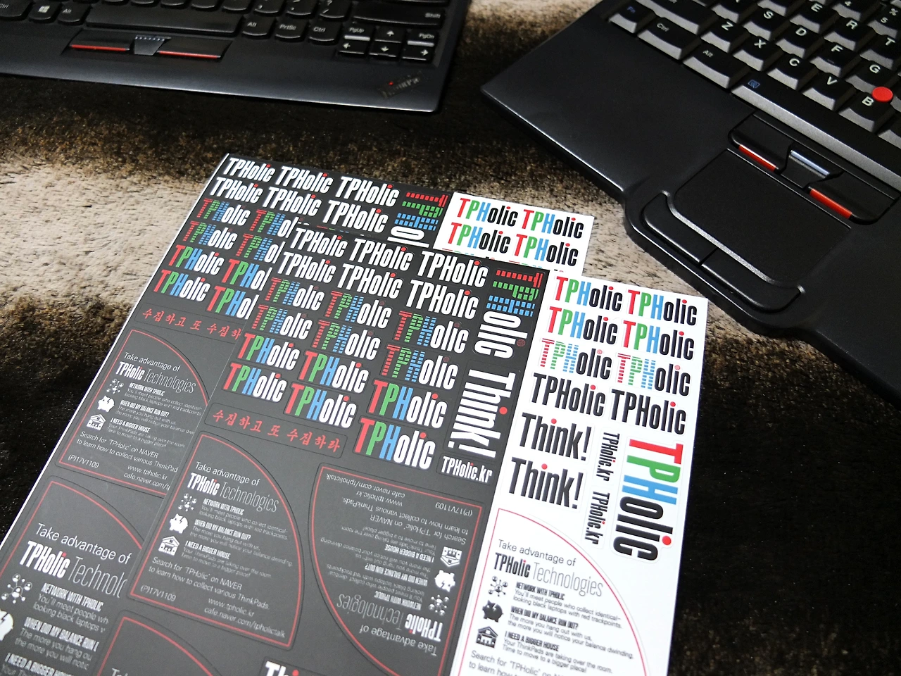 물론 똑같은 키보드이기에 똑같은 스티커를 또 붙이기에는 약간 아쉬움이 있습니다. 그래서 2024년에 TP홀릭에서 공구했던 스티커를 활용하였습니다. 키보드는 8855 배열에 가깝기도 하고, 씽크패드 유저들을 위한 커뮤니티 스티커라면 꽤 어울릴 듯합니다. 1호기는 오른쪽 상단에 IBM 로고가 있으니, 2호기에는 왼쪽 상단으로 위치를 바꿔서 부착하였습니다.