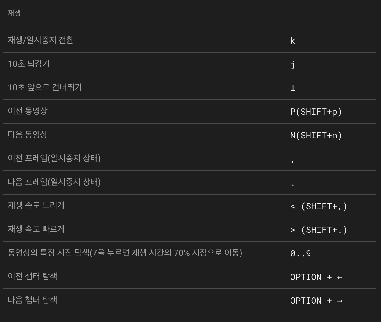 만일 영상에 챕터 설정이 되어있다면, 컨트롤키와 방향키 좌우로 이동할 수 있습니다. 그래서 영상 중간에 긴 숙제 분량이 있다면 건너뛰기도 가능합니다. [챕터 이동 Ctrl + ←/ →] (*맥에서는 OPTION + ←/ →)