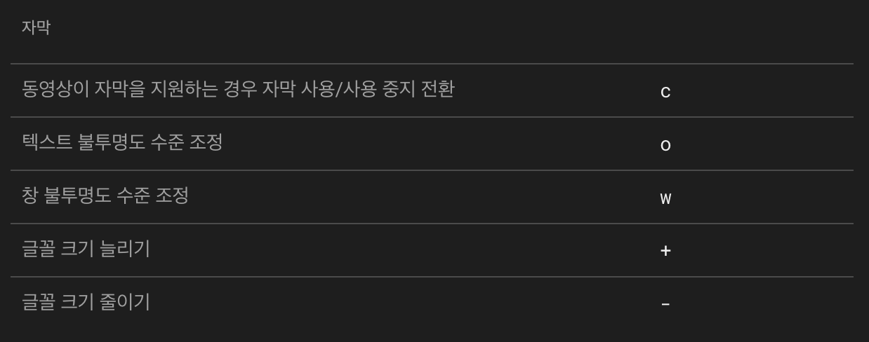상단 숫자키에서 -와 +키를 누르면 자막의 크기를 조정할 수 있습니다. [자막 크기 늘리기 + 줄이기 -], [글자의 투명도 조정 O, 글자 바탕색의 불투명도 조정 W]