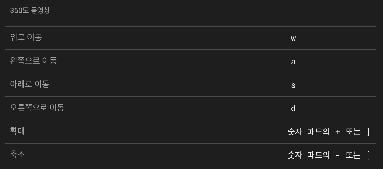 추가로 "360도 동영상" 영상에서는 게임처럼 WASD를 통해서 상하좌우 이동이 가능합니다.
