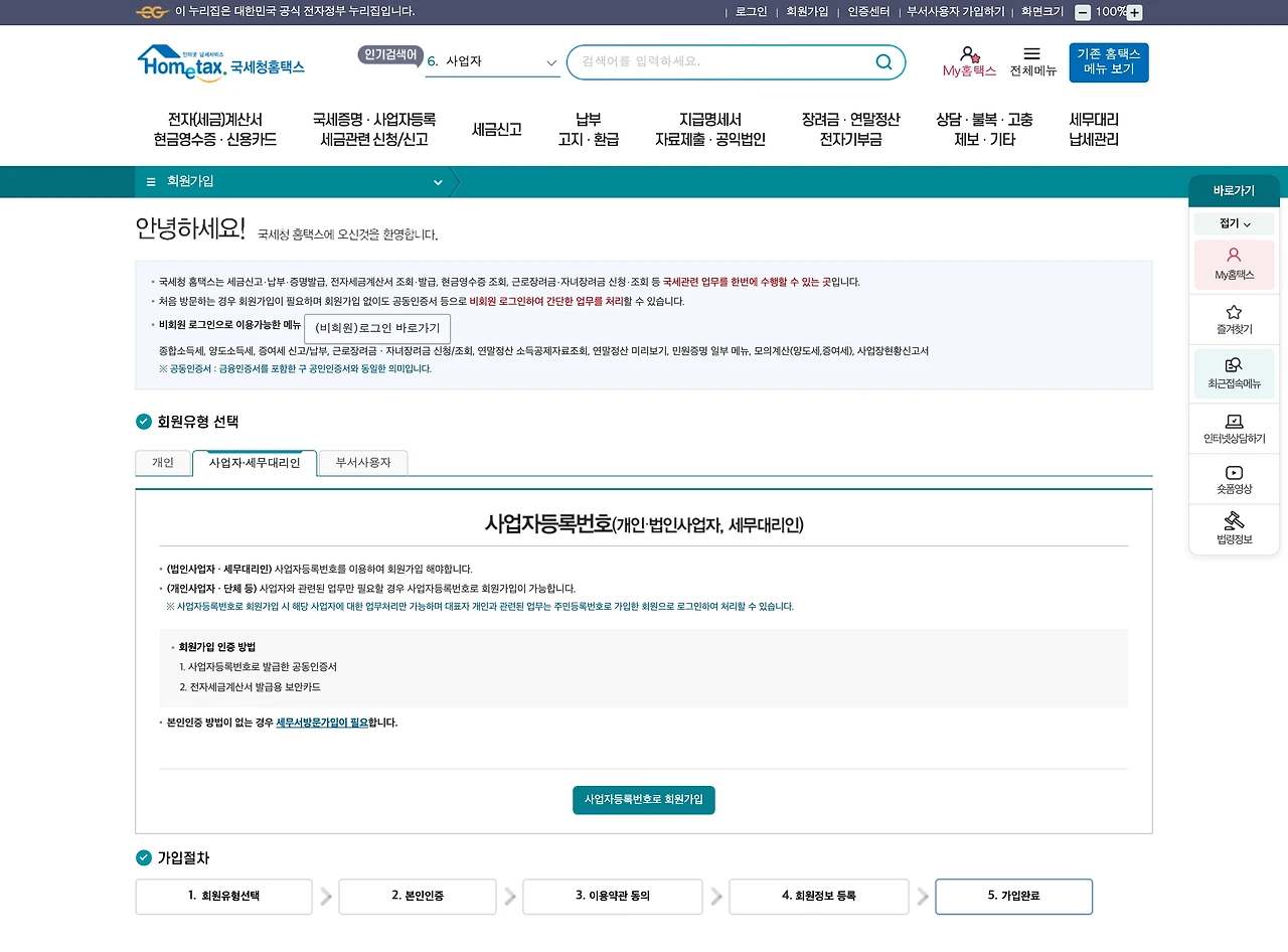 네이버에서 이런저런 검색어로 돌려보다 발견한 글은 사업자용 홈택스에서 ~라는 말이 써져 있었고, 회원가입을 눌러보니 [사업자. 세무대리인]으로 가입할 수 있었다.