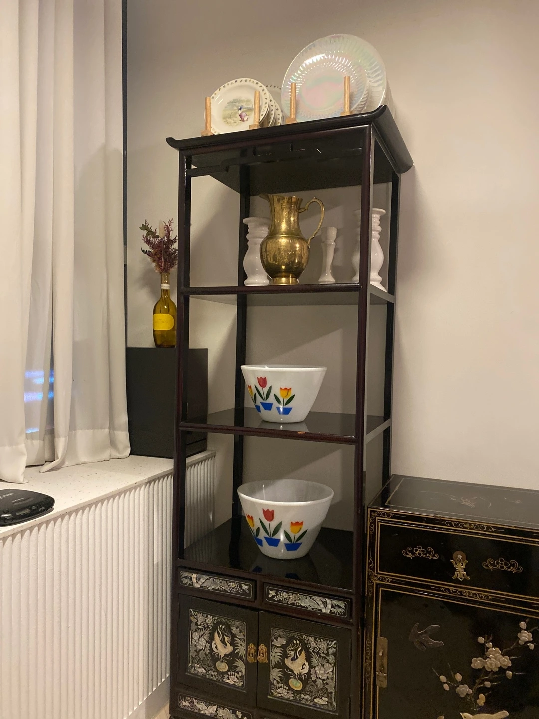 가구의 자세한 문양을 보면 화려해 보이지만, 가구를 배치한 뒤에 전반적인 분위기는 화려함보다 차분함에 가깝다. 의외로 화이트톤의 인테리어에 잘 어울린다. 오랜 세월이 흘러 빛바랜 듯한 미세한 반짝임이 마음에 든다. 그렇기에 자개 가구는 더더욱 새 제품을 사고 싶지 않다. 그건 너무 번쩍일 것만 같다.