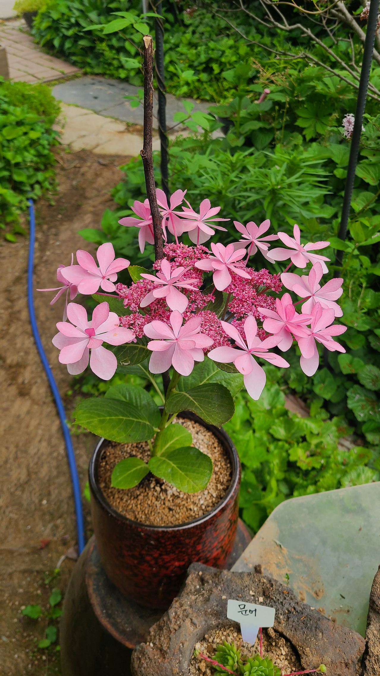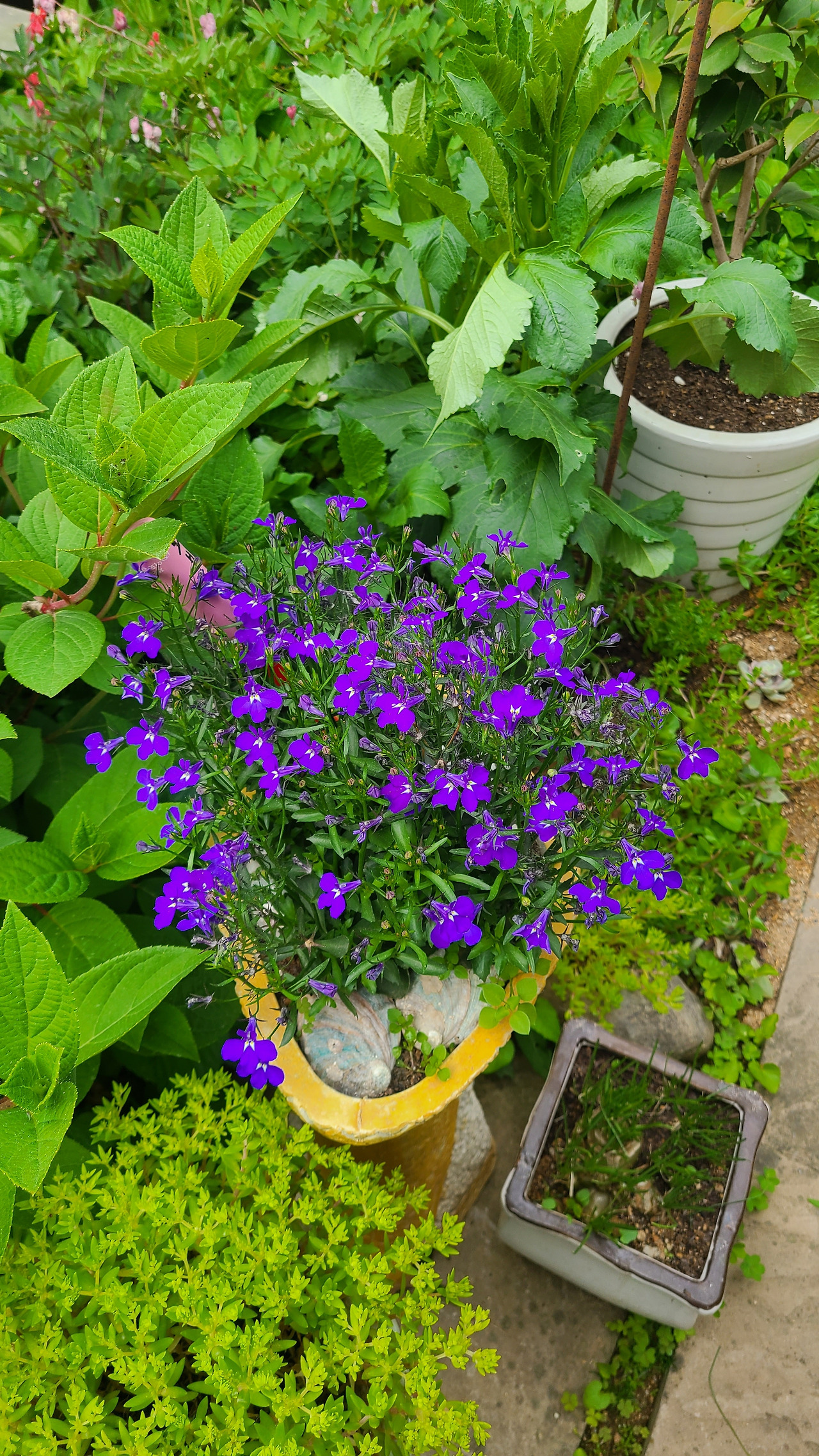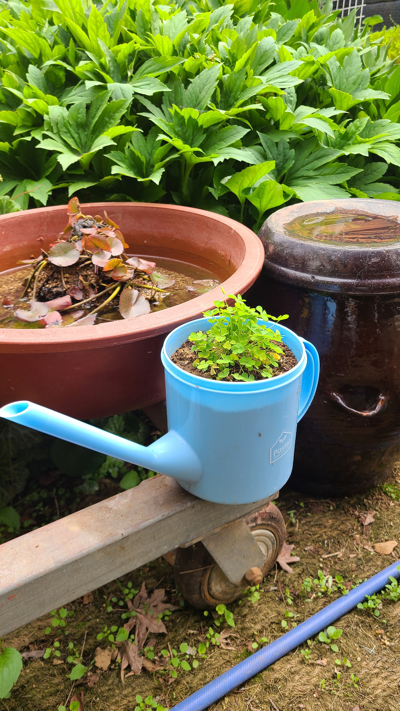 이 동네에 산 지 2년이 넘었지만, 산책은 항상 아파트 공원길로만 다녔었다. 처음으로 다니지 않던 둑길을 걸었다. 걷다가 마주한 담장의 진한 보랏빛의 으아리 꽃, 하얀색 수국이 발길을 멈추게 했다. 수국나무는 풍성한 꽃다발 같기도 하고, 솜사탕이 주렁주렁 매달려 있는 모습처럼 보였다. 대문이 열려 있길래 남편은 조심스레 정원을 구경해도 되는지 물었다. 이런 일이 자주 있으신 지 흔쾌히 편하게 돌아보라고 허락해 주셨다. 안으로 들어가니 더욱 다양한 식물들이 군생을 이루고 있었다. 흔히 잡초로 생각하는 클로버도 깨진 물조리개에 옹기종기 심어 놓으니 참 귀엽다.