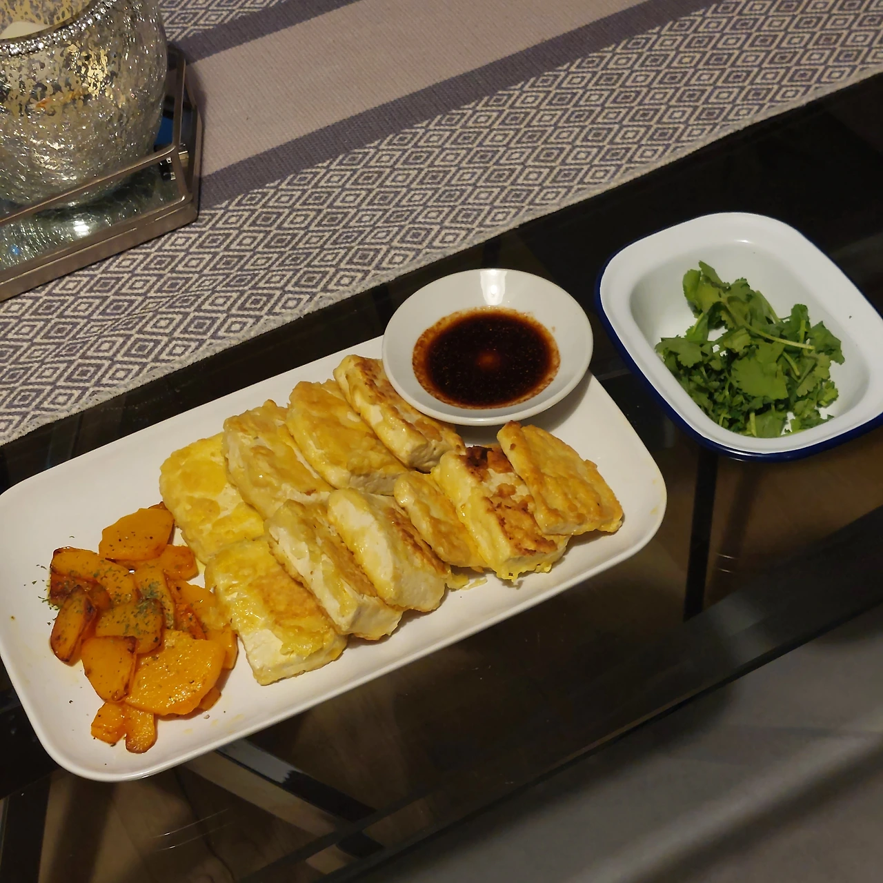 두부는 부드럽기보다는 쫀득한 스타일로 씹을수록 고소함이 올라왔다. 밀가루 얇게 묻혀서 계란물 입히고 지글지글 팬에 구워주었다. 우리나라 두부는 입자가 좀 성글어서 씹는 느낌이 별로 없는데, 이 두부는 굉장히 콩 입자가 빽빽하게 뭉쳐져 있는 느낌이랄까. 확실히 재료가 다르니 똑같은 조리법을 써도 전혀 다른 결과물이 나온다. 두부무침에 간장소스 없으면 섭섭하니 간장과 식초, 고춧가루를 섞어 찍어 먹었다.