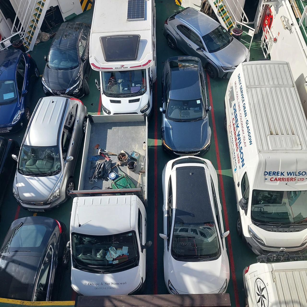 선박 꼭대기층에 올라가서 바라본 물오라, 그리고 페리를 가득 채운 차량들. 꽤 페리가 큰 편인데도 꼭대기에서는 소음과 흔들림이 심해서 멀미가 났다. 멀미에 취약한 사람은 가급적 1층에 앉아있는 게 좋다.