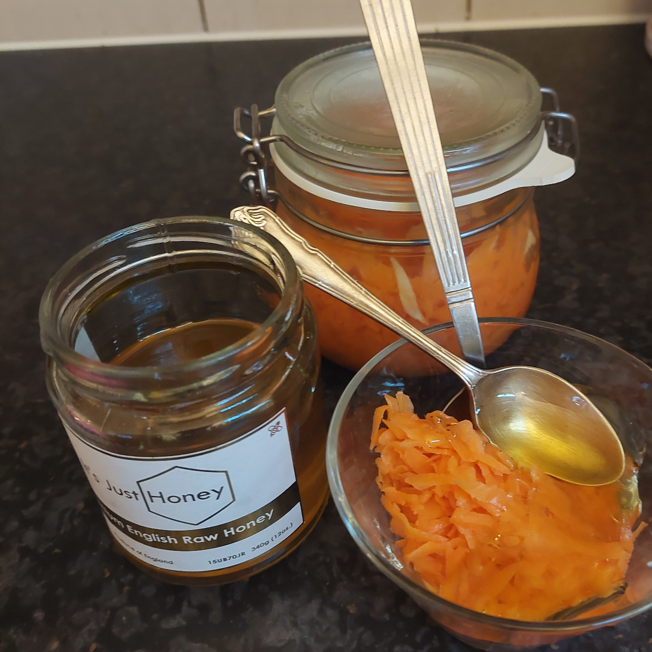 겨울이라 실온 온도가 낮은 편이기도 하고 신 맛을 좋아해서 10일 정도 발효 후 냉장고에 넣어주었다. 발효 당근은 아침마다 샐러드 토핑으로 활용하고 있다. 부재료로 생강과 칠리를 사용해 살짝 매콤한 맛이 돌아 더 맛있다. 당근 2큰술과 꿀 1작은술을 섞어서 샐러드에 올려주면 끝!