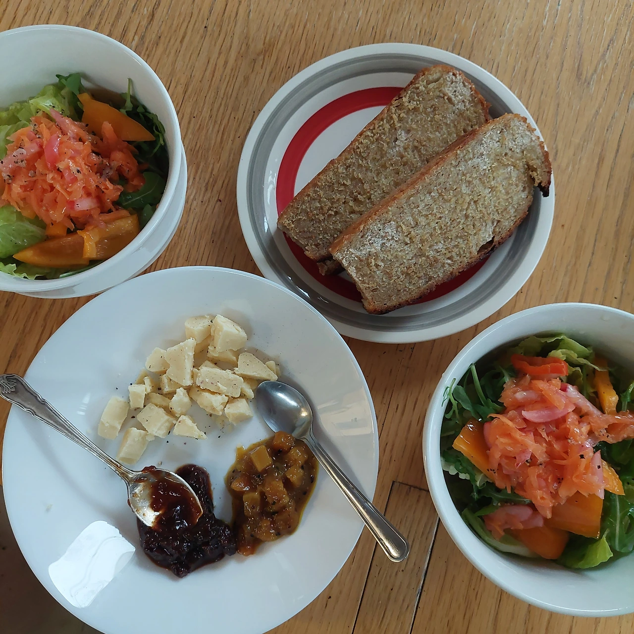 이 날의 주인공은 사워크라우트(발효한 양배추), 발효한 비트, 발효한 당근이다. 스타터로 비스킷에 발효한 야채들과 캐슈치즈(캐슈넛을 갈아 만든 비건 치즈)를 얹어 먹었다. 샐러드 토핑으로 활용할 때는 살짝 꿀이나 시럽을 섞어서 단 맛을 내 올려주었다.