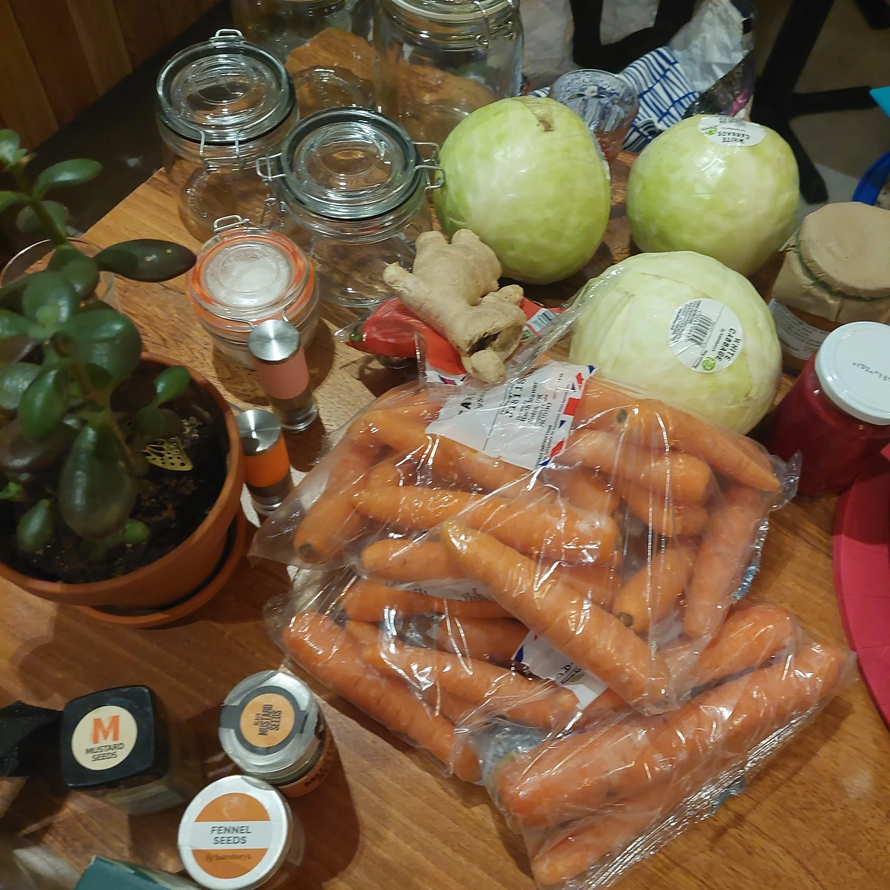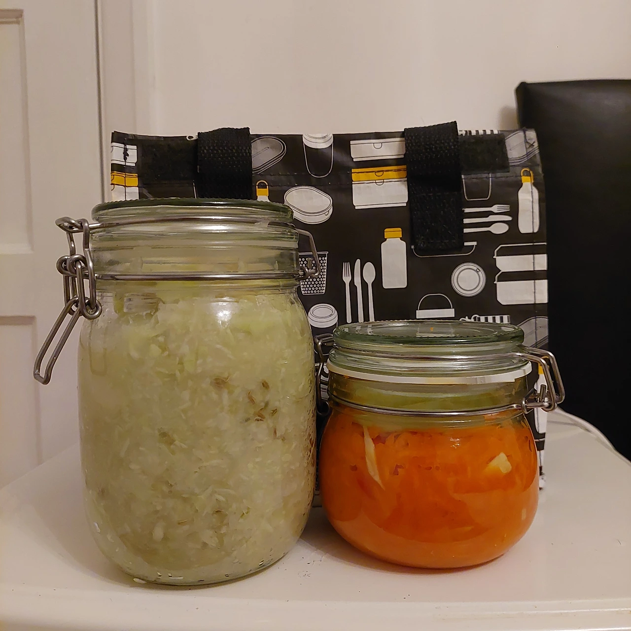 이렇게 양배추와 당근이 두 통 가득 챙겨 왔다. 이때부터 또 중요한 게 일주일 정도는 매일 조금씩 맛을 보며 원하는 발효의 정도, 신맛을 찾아줘야 한다는 점이다. 그리고 하루에 한 번씩 트림을 시켜주지 않으면 안 된다고 한다. 트림이라고? 뭔 뜻인고 하니 발효 과정에서 공기를 한 번씩 빼주지 않으면 넘쳐버릴 수 있기 때문에 뚜껑을 열어주는 걸 트림(burp)이라고 한단다. 소금 좀 넣어 섞어줬을 뿐인데 이렇게 살아 움직이듯 작용하고 맛이 매일 변한다는 게 신기할 따름이다.