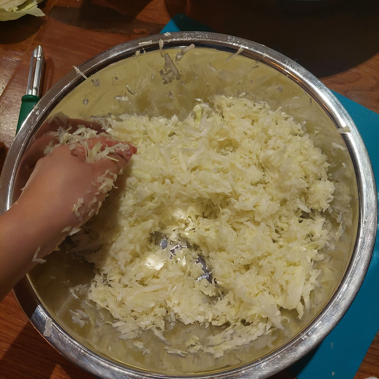 먼저 양배추의 지저분한 겉잎 1-2장을 통으로 떼어내 따로 챙겨둔다. 겉잎은 나중에 용기에 담고 나서 누름돌처럼 상단 여유 빈 공간을 채워 눌러주는 데 사용한다. 그리고 스테인리스 볼에 강판을 세워놓고 양배추를 통으로 갈아준다. 확실히 강판 사용을 많이 해보신 강사분이 훨씬 빠르고 능숙하다. 나는 반복 동작을 하다 보니 팔이 아파서 점점 속도가 느려졌다. 요령이 필요한 일이다.