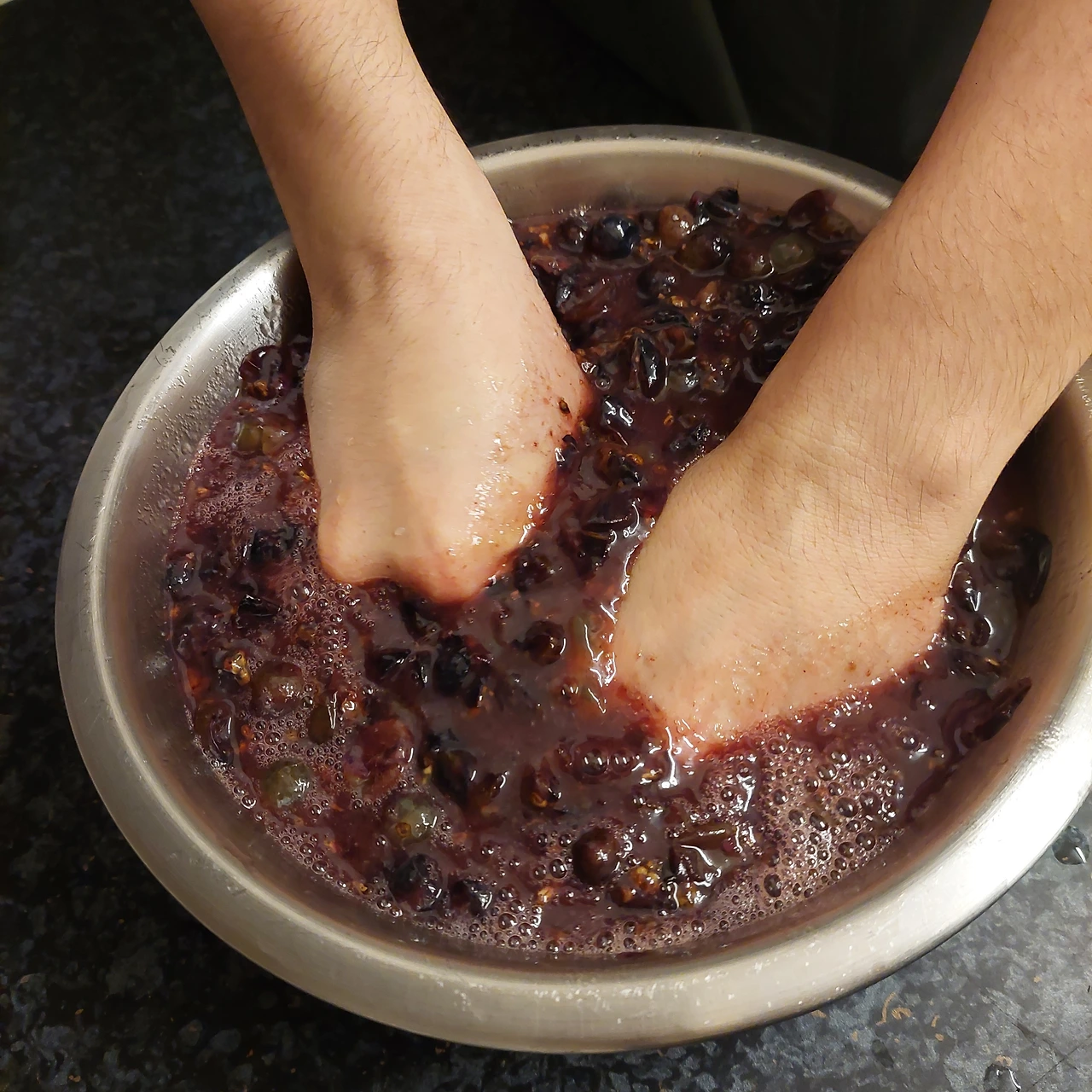 다음 단계로 손으로 꾹꾹 쥐어짜 포도즙을 내주었다. 상업 와이너리 양조 과정에서는 포도 알맹이를 터지지 않게 그대로 발효조에 넣고 발효 과정에서 이산화탄소가 발생하면 자연스럽게 껍질과 씨앗, 과육이 분리되는 과정을 거친다. 우리는 적은 분량의 홈브루이기 때문에 바로 즙을 내주었다.