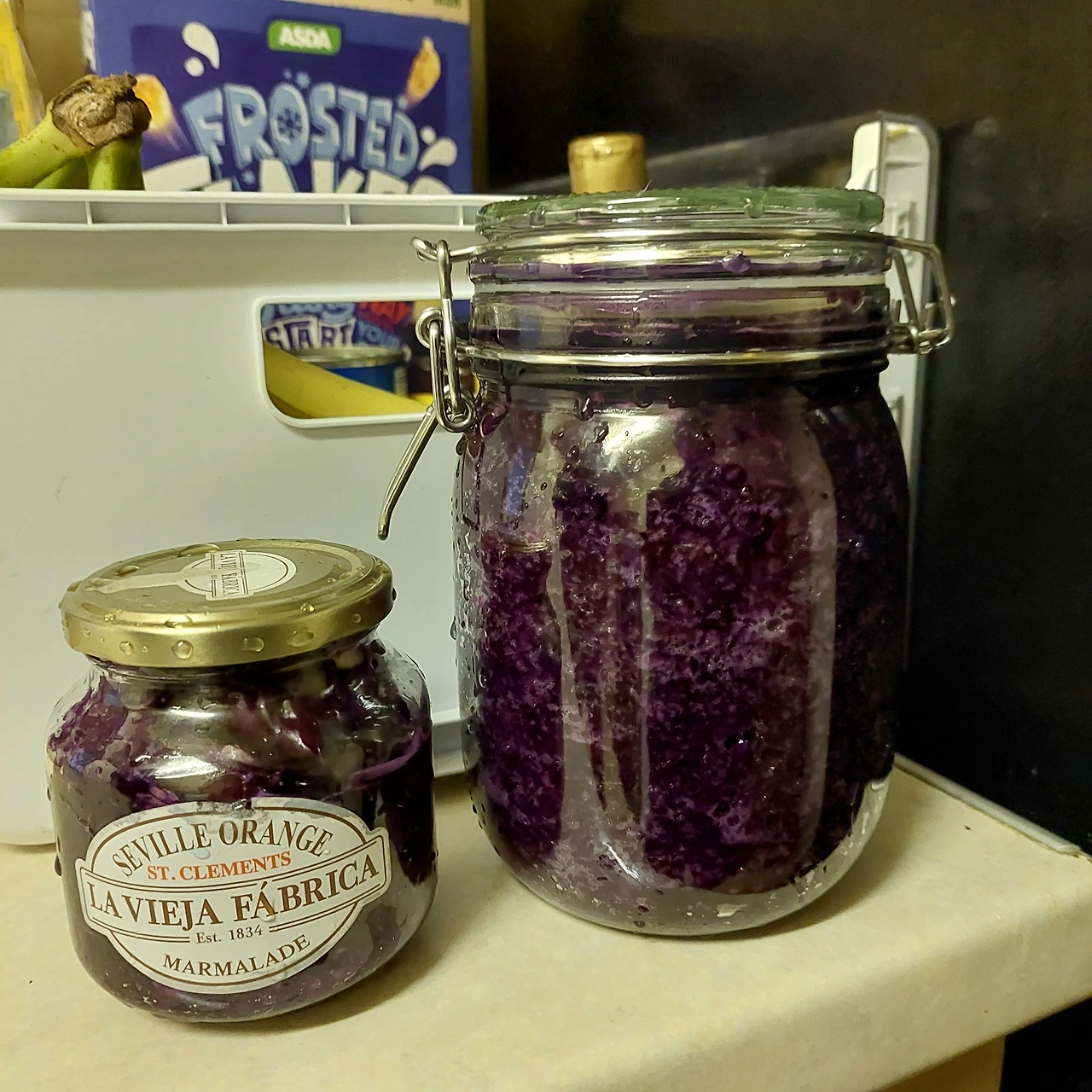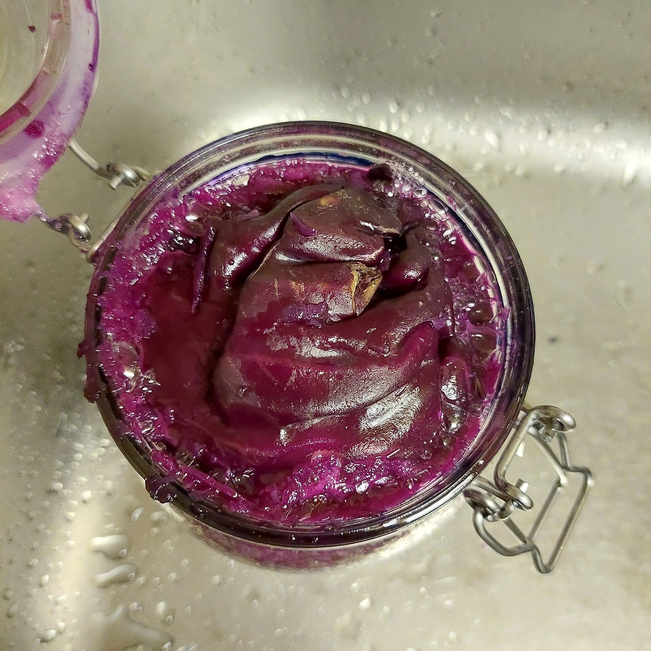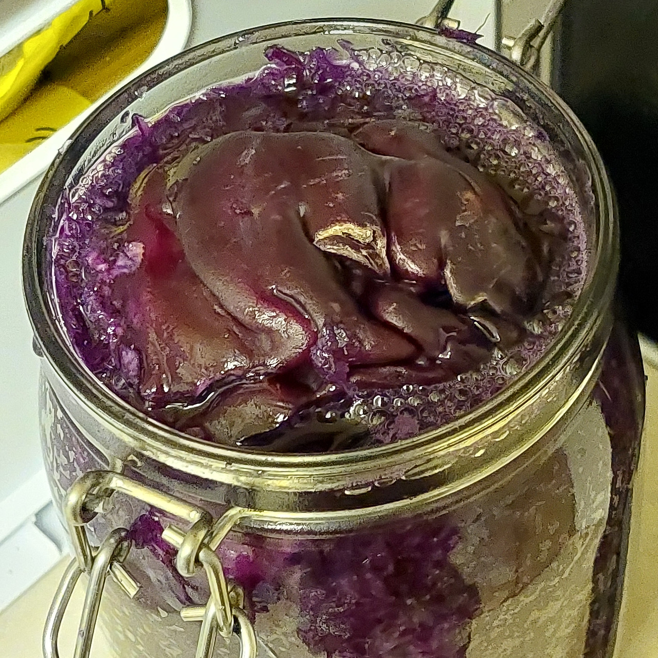 2일 차 : 적양배추 사워크라우트를 트림 시켜줬다. 여전히 생양배추 냄새다. 용기를 너무 가득 채웠는지 여는 순간 액체가 스프레이처럼 뿜어져 나와 옷에 튀었다. 보라색이라 지우기도 어려운데, 열 때 튀지 않도록 조심 또 조심!