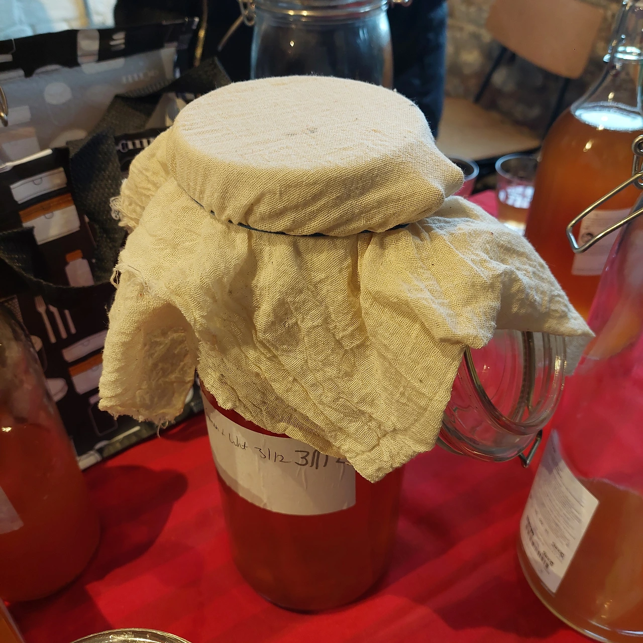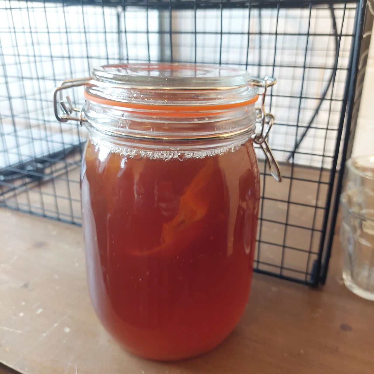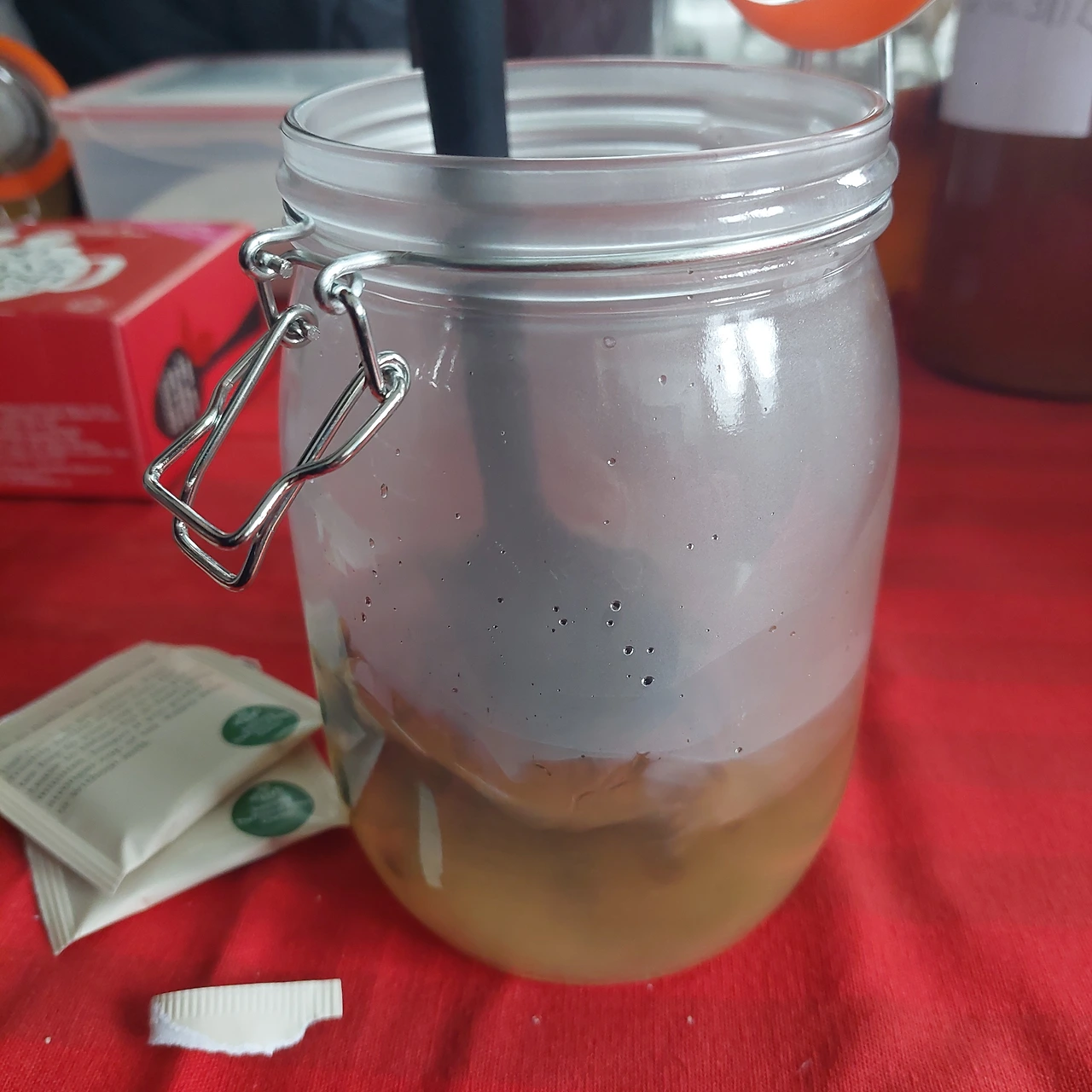 이제 남은 건 기다림의 시간이다. 상온에서, 가능하면 집에서 가장 따듯한 위치에 두면 발효에 도움이 된다. 뚜껑을 닫지 않은 채로 면포와 고무줄로 덮어 이물질이 들어가지 않게 해 준다. 만든 지 5일이 지났는데 요즘 날씨가 너무 추워서 그런지 아직 새콤한 맛이 들지 않았다. 5-10일이 걸린다고 하는데 아무라도 5일은 더 기다려야 할 것 같다. 콤부차가 마음에 드는 정도로 맛이 들면 스코비와 다음 배치를 위한 100ml를 남겨둔 뒤 병입하면 탄산화가 시작된다. 그대로 마셔도 되지만 맛을 추가하려면 이 단계에서 2줌 정도 과일이나 허브류를 넣어 며칠 더 상온에 발효하면서 우러나길 기다린다. 무엇을 넣어볼까? 지금 배가 많으니 하나엔 배를 넣어보고, 하나는 석류를 사용해 볼까?