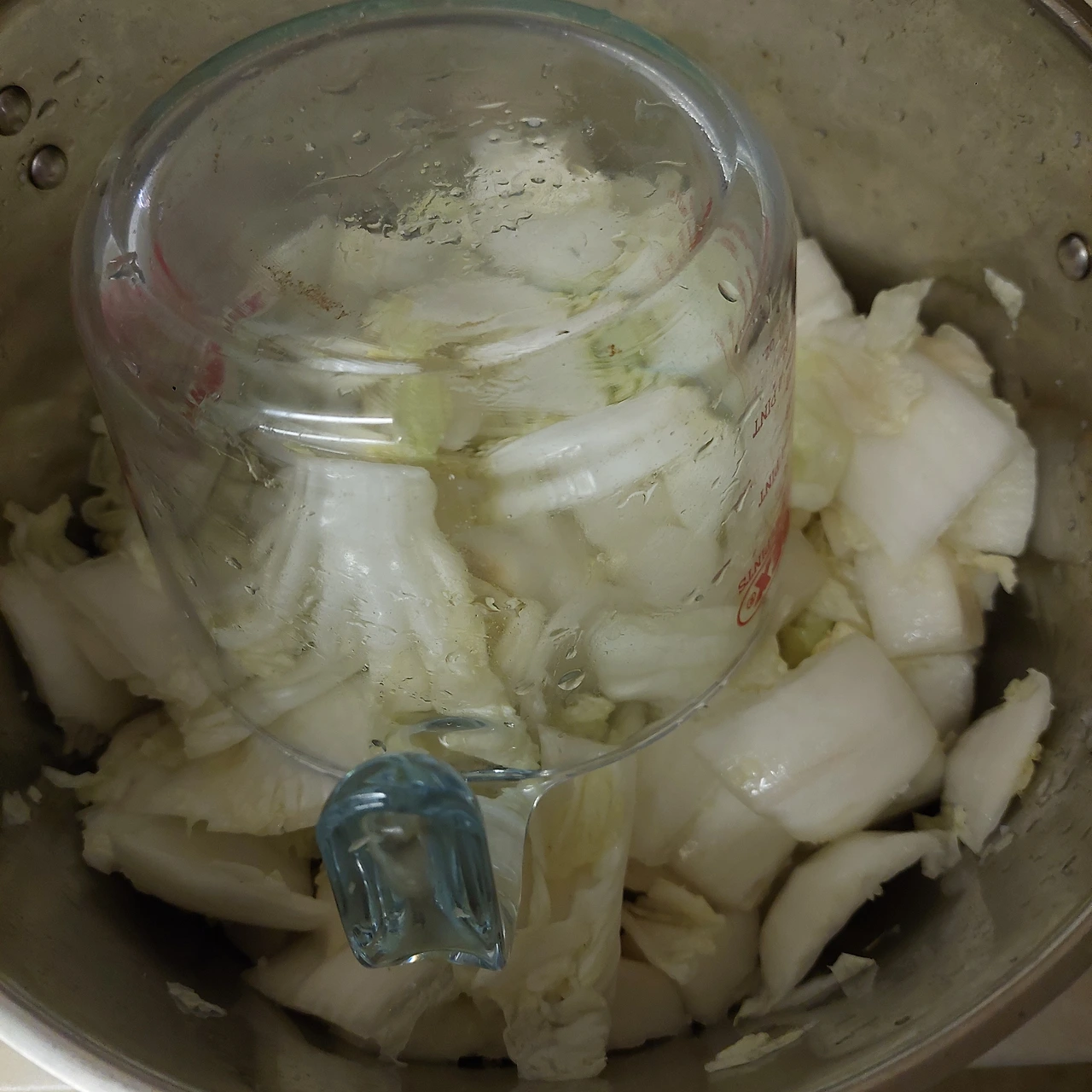 그 사이에 만든 김치 속이다. 시원한 맛에 먹으려고 채 썬 무를 잔뜩 넣었다. 파와 다진 마늘, 다진 양파, 다진 생강, 고춧가루, 새우젓, 액젓 대신 피시소스, 매실청 대신 수제 배청으로 만들었다. 조금씩 맛을 봐가며 재료들의 양을 조절했다. 마지막으로 찹쌀 풀을 쑬 수 없어서 밀가루 풀을 만들어 넣고 섞어줬다.