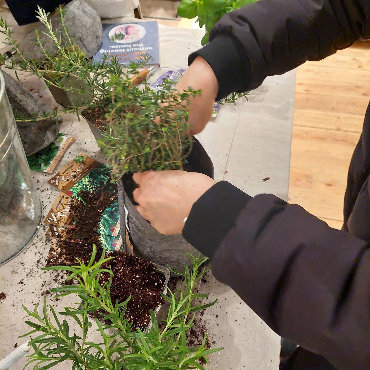 먼저 개략적인 설명을 들은 뒤 부직포 같은 소재의 화분에 흙과 자갈을 적절히 섞어 담고 식물들을 심어주었다. 일반적인 화분은 뿌리가 벽에 닿을 때까지 자란 경우 더 뻗어나가지 못하는데, 이 화분은 화분 사이로 뚫고 자잘한 뿌리를 더 뻗을 수 있어 좋다고 한다. 가볍고 자연분해되는 소재라는 것도 장점이다.