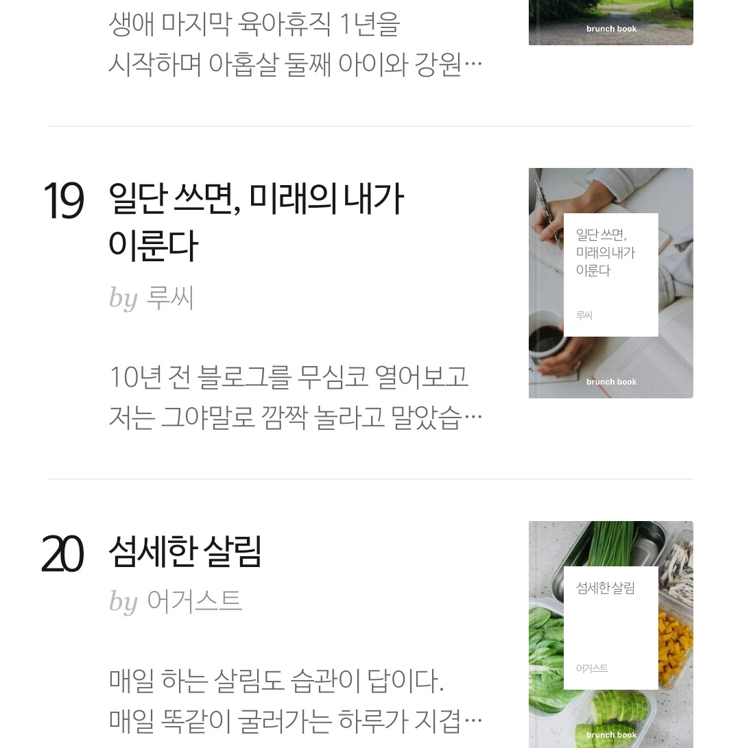 이 밖에도 믿을 수 없을 만큼 신기한 행운도 많이 따랐다. 내가 쓴 리스트에는 블로그 구독자수 몇 명 이상, 브런치 구독자수 몇 명 이상 달성도 있다. 현재의 수치와는 많이 먼 수준이다. 목표를 쓰고 며칠 뒤 네이버 블로그 인플루언서에 재도전했더니 역시나 또 떨어졌다. 그래도 예전 같으면 이내 실망하고 그냥 포기했겠지만, 문자화된 목표의 힘을 믿게 된 나는 포기하지 않았다. 계속해서 어떻게 하면 '나만이' 할 수 있는 콘텐츠를 올릴 수 있을까 고민하고 틈틈히 글을 올렸다. 그 결과 이 브런치북의 이전 글인 '날 위한 작은 즐거움 하나쯤은 남겨두자'가 브런치 메인에 떠서 엄청나게 많은 분들이 공감과 구독을 눌러주시며 몇년째 정체상태였던 내 브런치의 구독자가 엄청나게 늘어났다. 아직 완결이 나지도 않은 브런치북이 잠시나마 많이 읽은 브런치북 상위 20위에 들기도 했다.