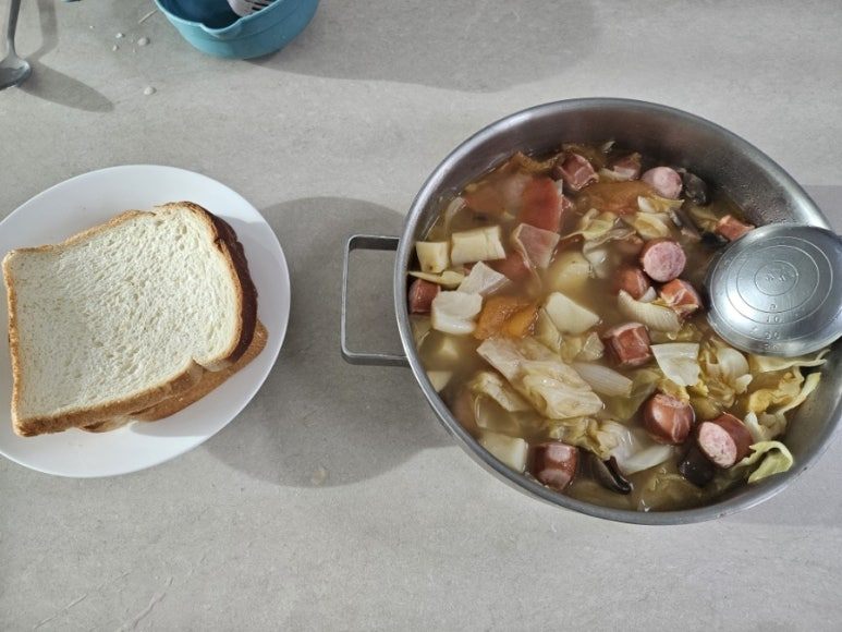 겨울철, 날이 쌀쌀할 땐 국물 요리가 생각난다. 이럴 땐 양배추와 소시지, 토마토, 그리고 냉장고에 있는 갖은 야채를 대충대충 큼직하게 썰어 물에 넣고 치킨스톡 한 스푼과 충분히 끓여 내면 그럴싸한 '포토푀'가 된다. 따끈하게 구운 식빵에 찍어 먹으면 더욱 맛있다.