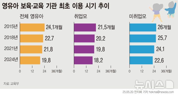 교육부에 따르면 2024년 기준 우리나라 영유아들은 평균 19.8개월에 어린이집에 다니기 시작한다. 이 중 엄마가 취업한 경우(워킹맘)는 18.2개월, 엄마가 전업주부인 경우(미취업모)는 22.6개월로 조사됐다. 와중에 아빠의 취업여부는 따로 명시하지도 않고 '엄마'만 갈라세운 것도 상당히 시대착오적이라는 생각이 들지만, 우리나라의 유자녀 맞벌이 비중이 딱 50% 정도라고 하니(아빠의 경우 연령대를 막론하고 취업비율이 95%를 넘는다) 당위를 떠나 현실적인 조사를 위해 불가피할 수 있어 이 글에서는 논외로 하자.