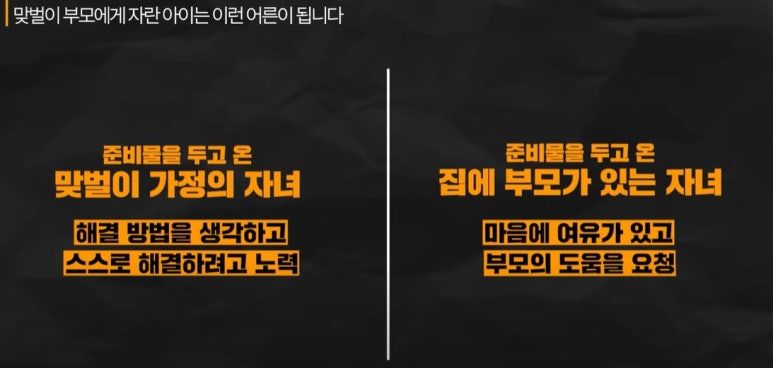영상에서 근거로 제시하는 초등 교사분의 경험담에 따르면(이 또한 개인의 경험일 뿐이라는 한계도 있다) 아이가 준비물을 가져오지 않은 경우 맞벌이 가정의 아이는 당황하면서 스스로 해결책을 찾으려 하지만, 엄마가 집에 있는 아이는 여유 있게 엄마에게 도움을 요청한다는 것이다.