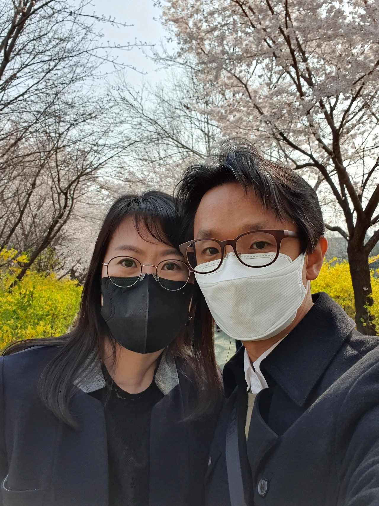 지난봄, 우리 부부, 사진 찍을 때마다 꼭 한 발짝 뒤로 가는 마누라.