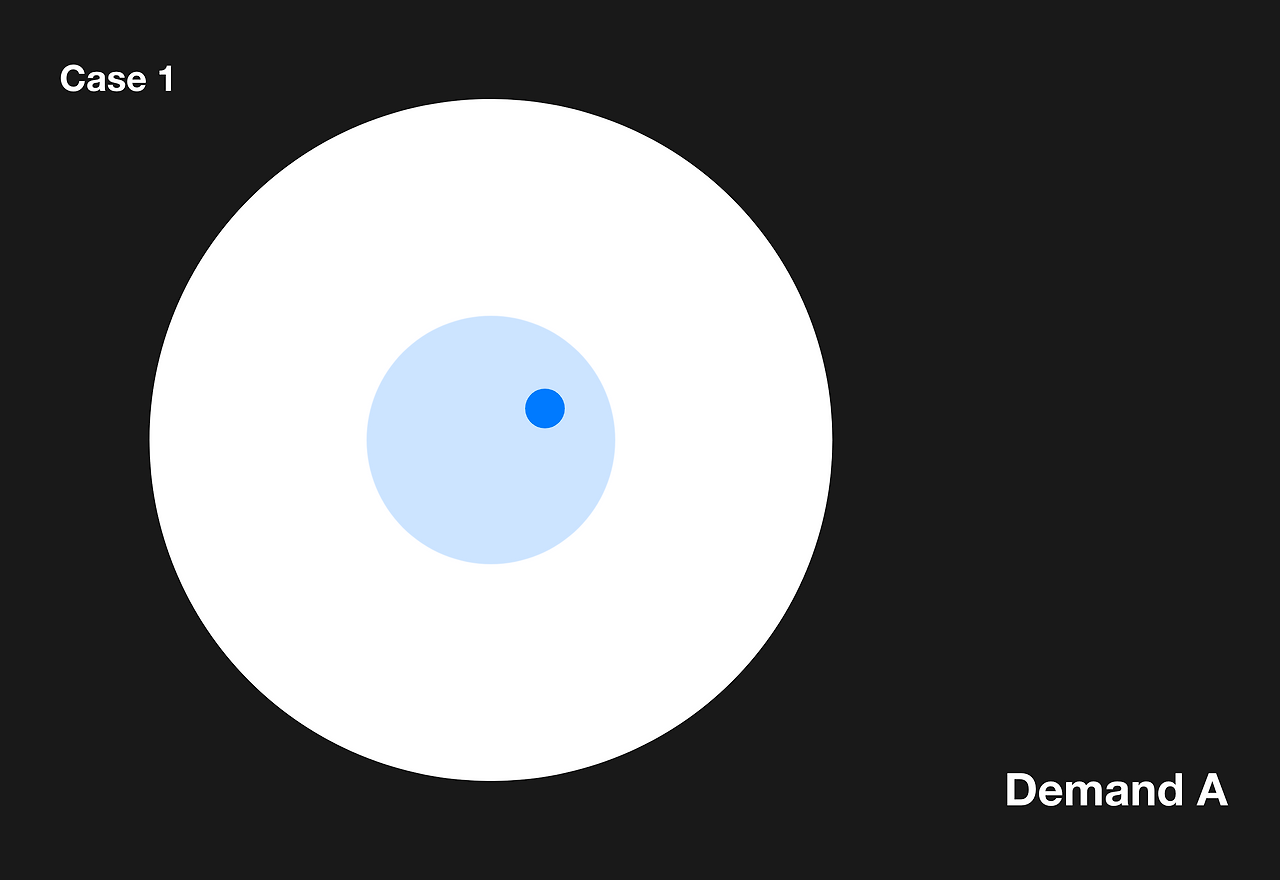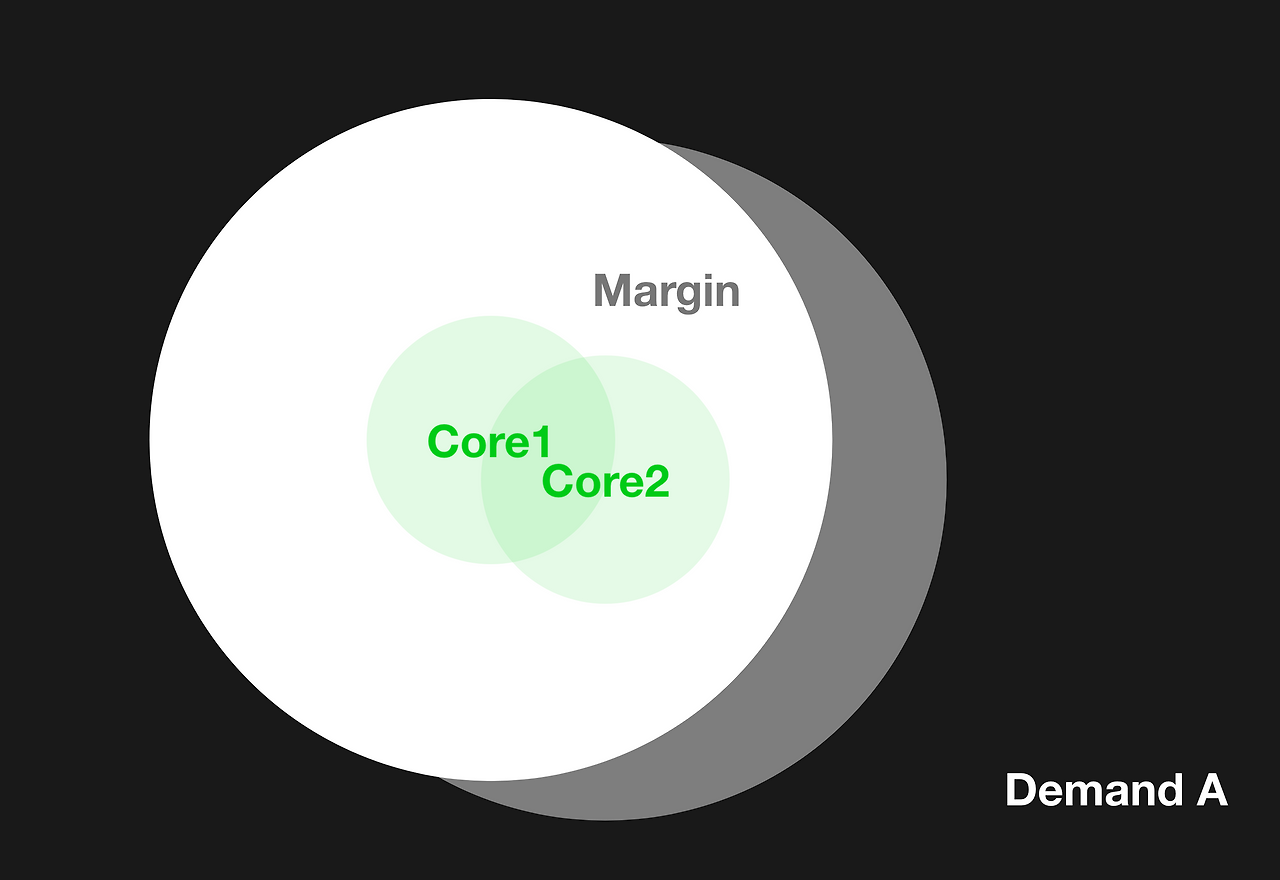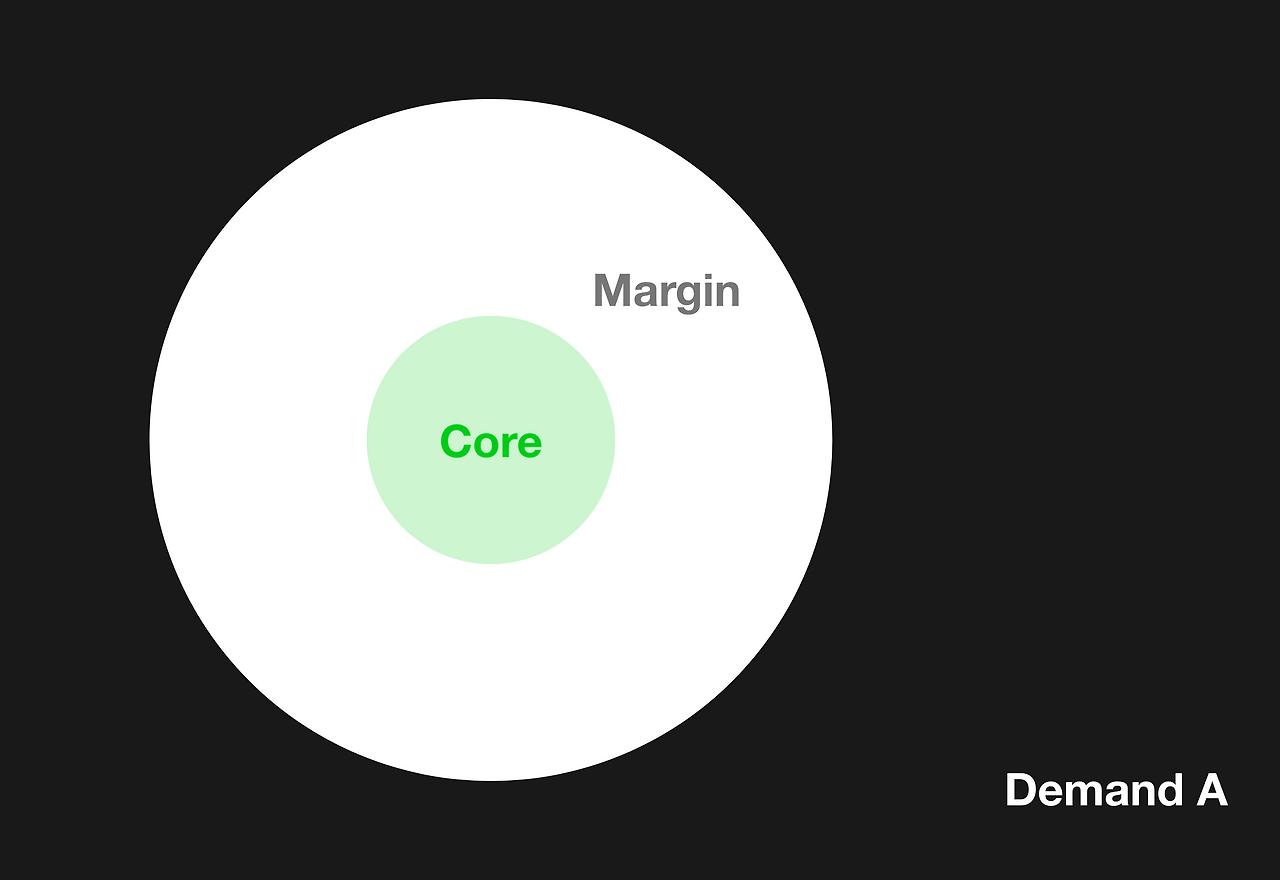 어떤 미지(A)의 Demand Chunk에는 중심부 수요(Core Demand)와 주변부 수요(Marginal Demand)가 있다. 해당 수요의 상위 20% 범위에서 더 강렬하게 수요 하는 부분을 중심부 수요, 그리고 그 외의 부분을 주변부 수요로 나누었다. 해당 수요를 충족시켜줄 제품/서비스가 출시되었을 때, Early stage에서부터 그 제품을 사용하며 지불의사도 높은 segment가 중심부 수요층이다. 이 중심부 수요를 타깃 하여 제품/서비스를 개발해나가야 한다.