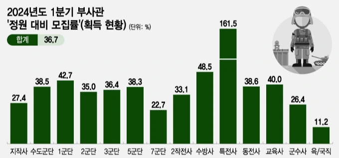 결과는? 육사의 조기 전역 신청률, ROTC 경쟁률, 부사관 모집률, 각 일선 부대별 초급간부 미보충 현황을 보면 금방 드러난다. 더 이상 젊은 이들에게 직업군인은 병사에 비해 매력적인 선택지가 아닌 것이다.
