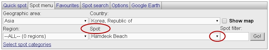 위의 그림의 중간 부분 “Country”아래 부분에 “Spot” 우측에 있는 화살표를 클릭하게 되면 국내의 서핑포인트를 검색한 후 자신이 자주 가는 서핑포인트를 클릭하고 “Go”를 누르게 되면 지정한 서핑 포인트에 대한 정보가 뜨게 됩니다.