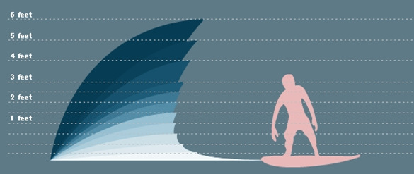 그러나 파도의 반대쪽에서 계측한 높이가 90cm이라면, 해안 쪽에서 바라보는 파도의 높이보다 약 2~3배 정도 큰 사이즈라고 보면 됩니다. 파도의 반대쪽에서 “허리”정도의 사이즈 라면 해안 쪽에서 바라보았을 때는 “머리-오버헤드” 정도로 사이즈라 두 배 이상 되어 버립니다.
