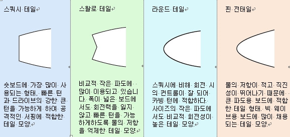 파도에서도 원활한 턴을 가능하게 합니다. 아래는 대표적인 테일의 모양에 대한 설명입니다.